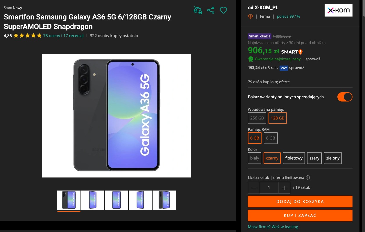 Kolejną propozycją jest Samsung Galaxy A36 w wersji 6/128 GB. To stosunkowo tani telefon, który w promocji Allegro Days pozostało tańszy – zamiast 1099 zł kosztuje 906 zł (niemal 200 zł mniej) dla posiadaczy Smart!. W tej cenie jest jedną z najlepszych propozycji.