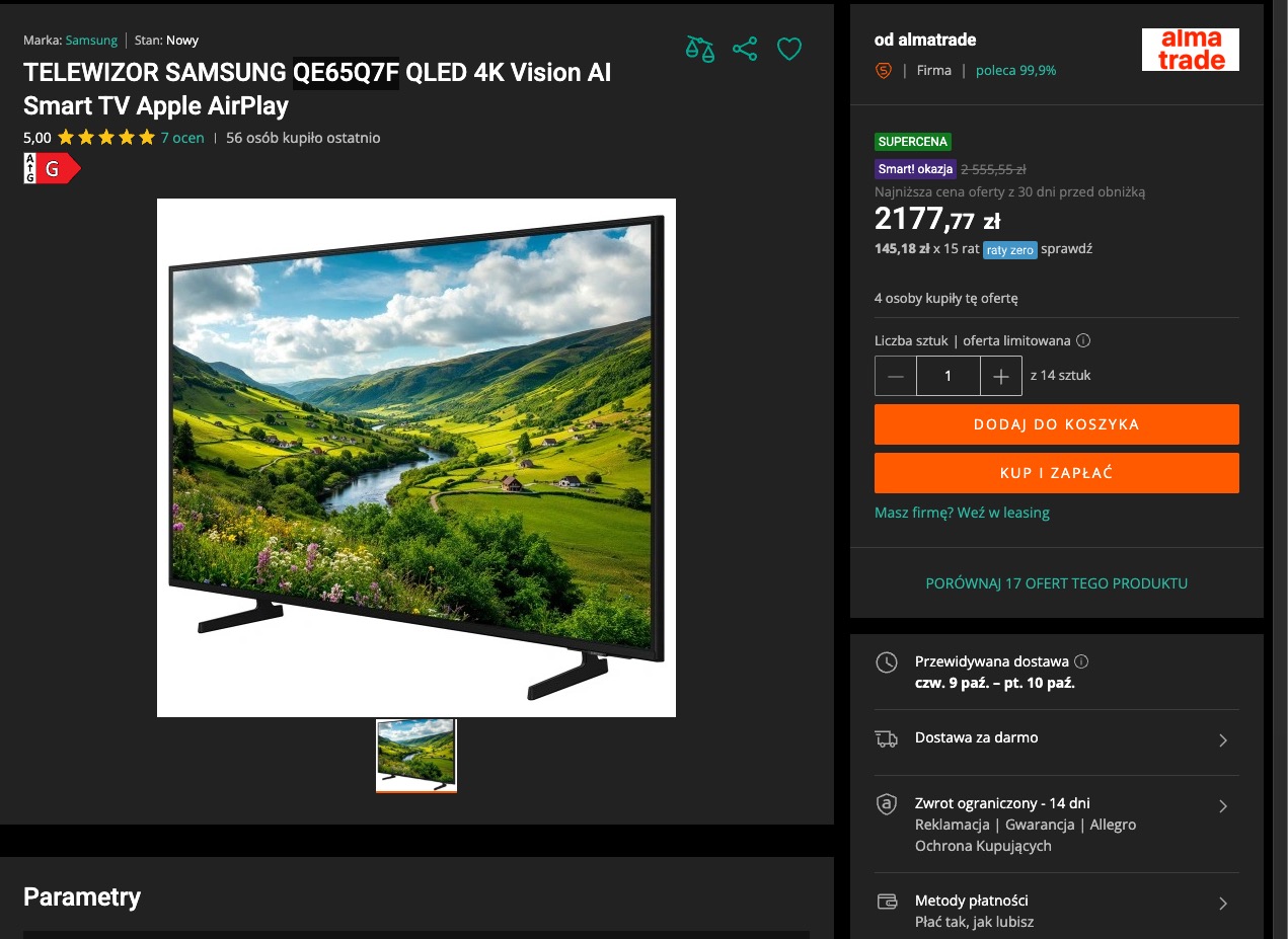Posiadacze Allegro Smart! mogą też kupić 65-calowy telewizor Samsung QLED QE65Q7F. Sprzęt w promocji kosztuje 2177,77 zł (zamiast 2555,55 zł) i jest to znacznie niższa cena niż w innych sklepach z elektroniką. Za urządzenie trzeba dać choćby 1000 zł więcej!