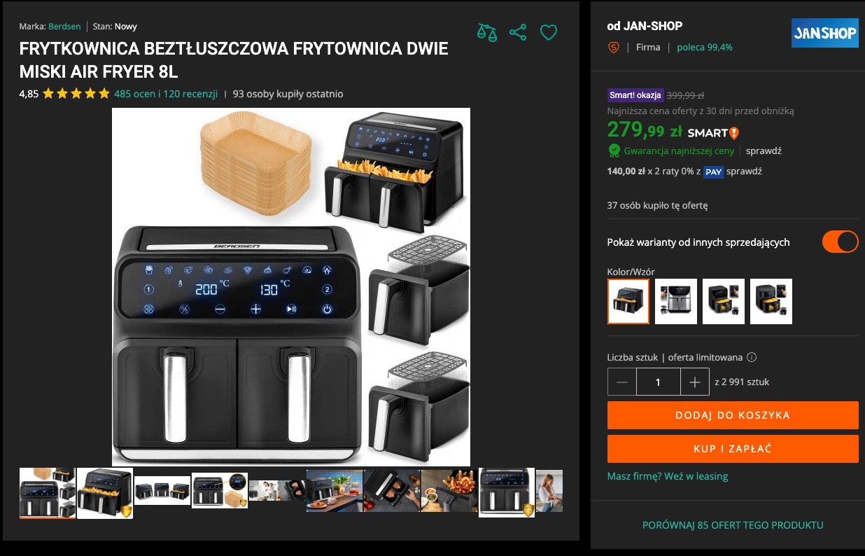 W cenie 280 zł można kupić frytkownicę beztłuszczową wyposażoną w dwie miski o łącznej pojemności 8 litrów (2 x 4 l). Domyślna cena urządzenia to 400 zł – mówimy zatem o promocji na poziomie 120 zł.