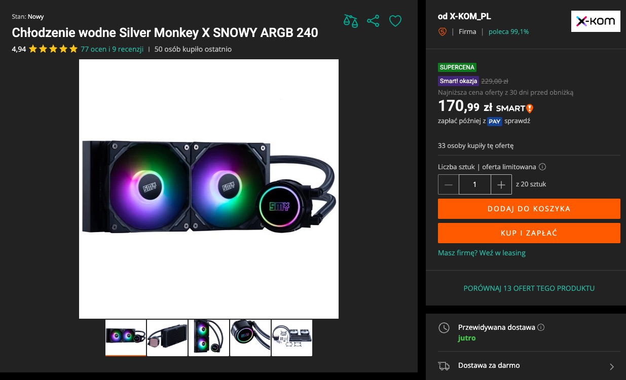 Na koniec warto wspomnieć o promocji na Silver Monkey X – 240-milimetrowe AiO Snowy ARGB. W ramach Allegro Days sprzęt kosztuje zaledwie 170,99 zł, zamiast 229 zł. To tanie chłodzenie wodne do komputera dla procesorów AMD Ryzen oraz Intel Core.