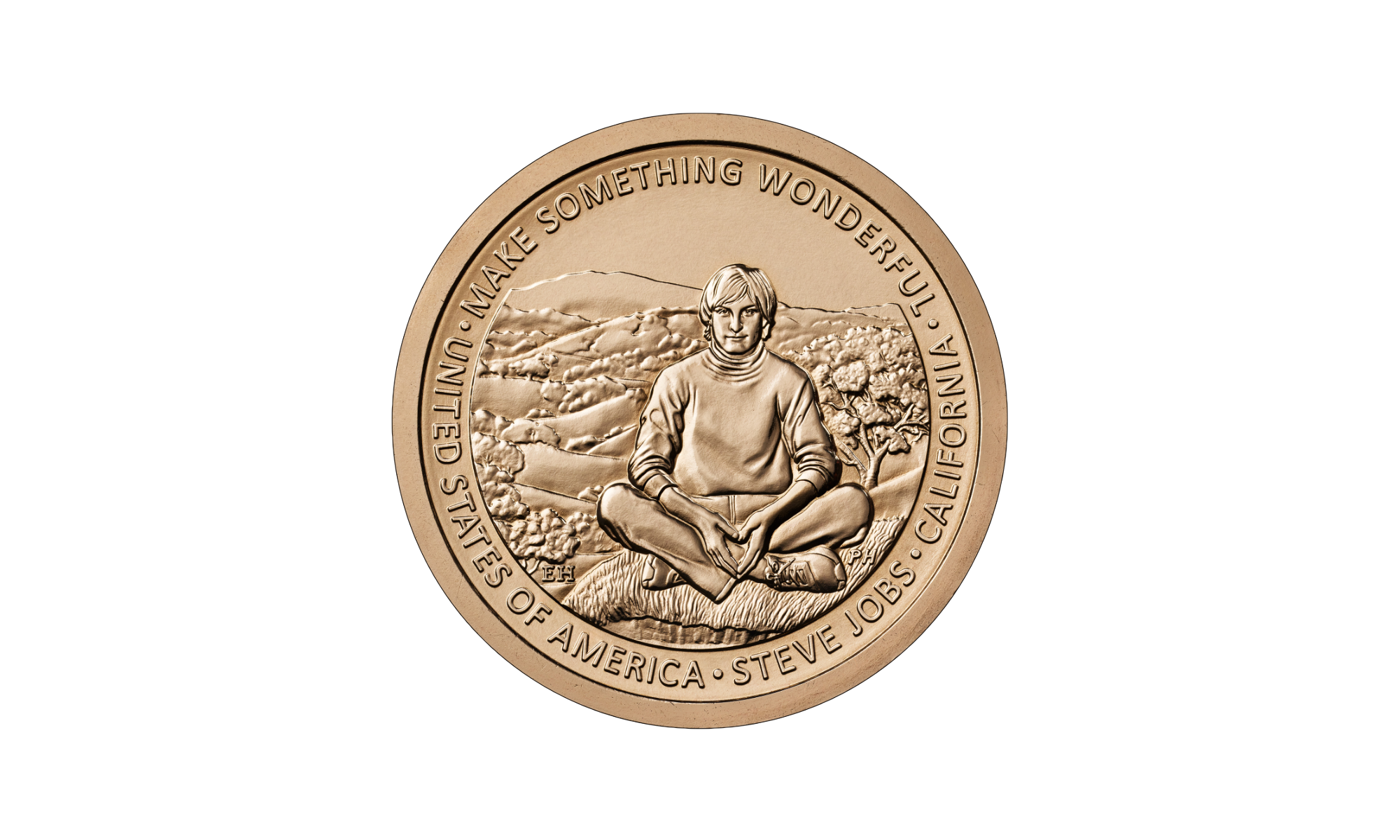 Moneta przedstawia młodego Jobsa w golfie, dżinsach i trampkach, siedzącego na tle krajobrazu północnej Kalifornii. Na monecie widnieją napisy: „MAKE SOMETHING WONDERFUL”, „UNITED STATES OF AMERICA”, „CALIFORNIA” oraz „STEVE JOBS”.