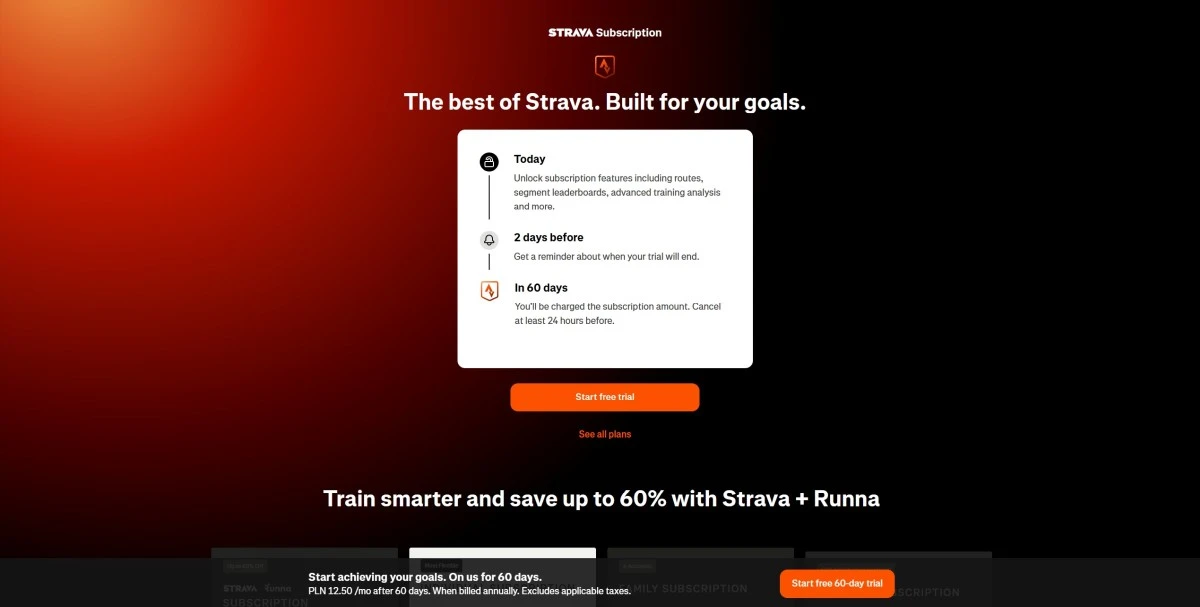 Za nową promocję na subskrypcję Strava Premium za darmo odpowiada nie kto inny, a administracja popularnego serwisu. Wystarczy przejść pod ten adres, aby sprawdzić, czy przysługuje Wam 60-dniowy darmowy okres próbny. Wystarczy kliknąć na przycisk Start free trial i wykonać instrukcje wyświetlane później na ekranie urządzenia. Co istotne, po zakończeniu darmowego okresu próbnego subskrypcja automatycznie przedłuży się na kolejny, płatny już okres. Co zrobić, aby uniknąć opłaty?