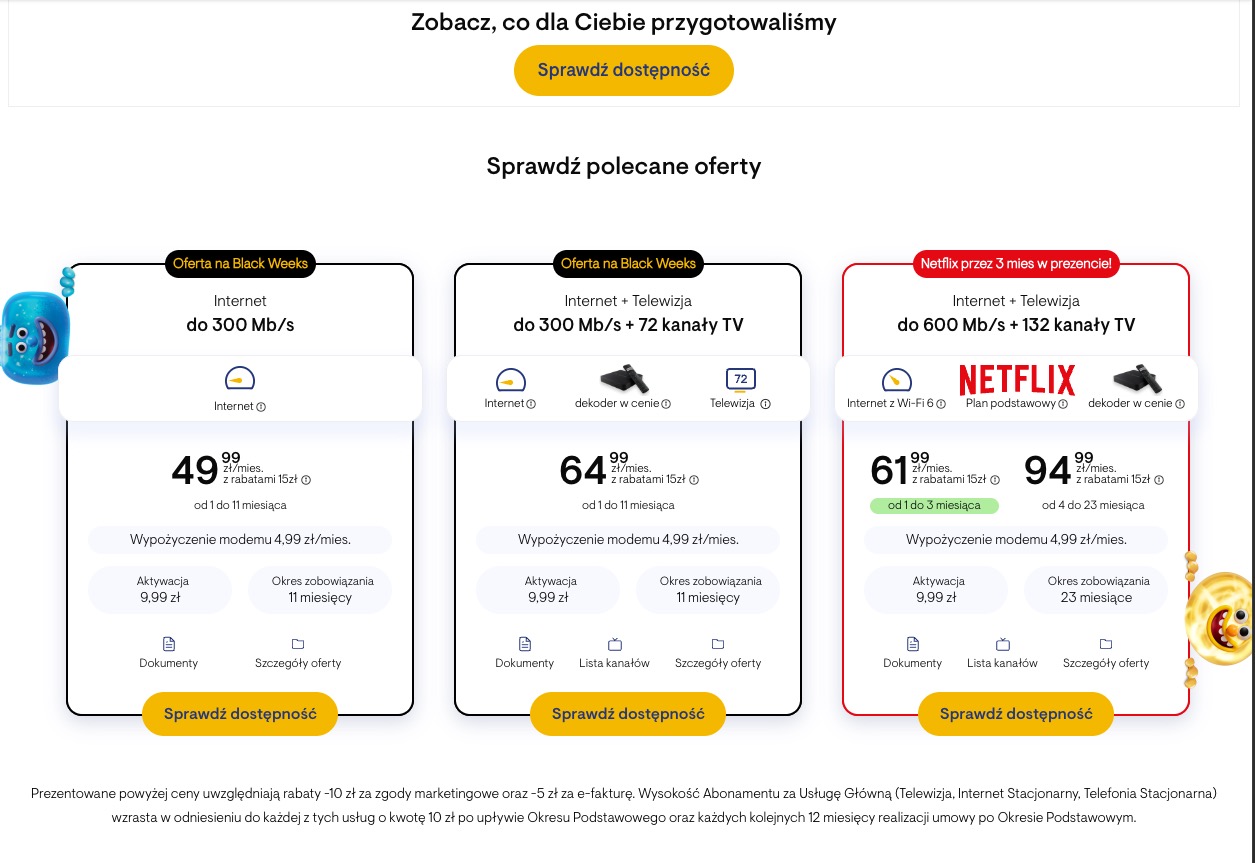 Umowa trwa 11 miesięcy, z opłatą aktywacyjną 9,99 zł. Po zakończeniu okresu promocyjnego cena wzrasta o 10 zł rocznie. Wszystkie ceny obejmują też rabaty: 5 zł za e-fakturę i 10 zł za zgody marketingowe.