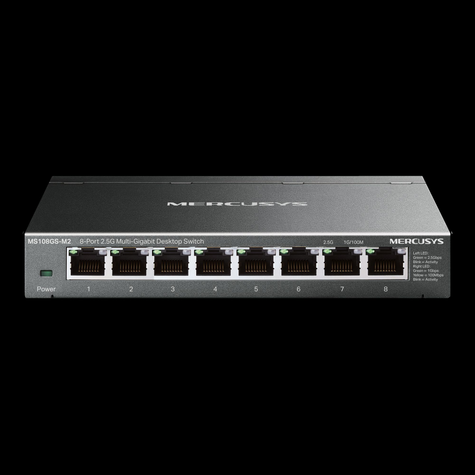 Model MS108GS-M2 to 8-portowy przełącznik typu desktop. Co istotne, każdy z ośmiu portów oferuje przepustowość do 2,5 Gb/s. Pozwala to na jednoczesne podłączenie wielu wymagających urządzeń, takich jak komputery, konsole, telewizory czy serwery NAS, w celu pełnego wykorzystania szybkiego łącza internetowego.