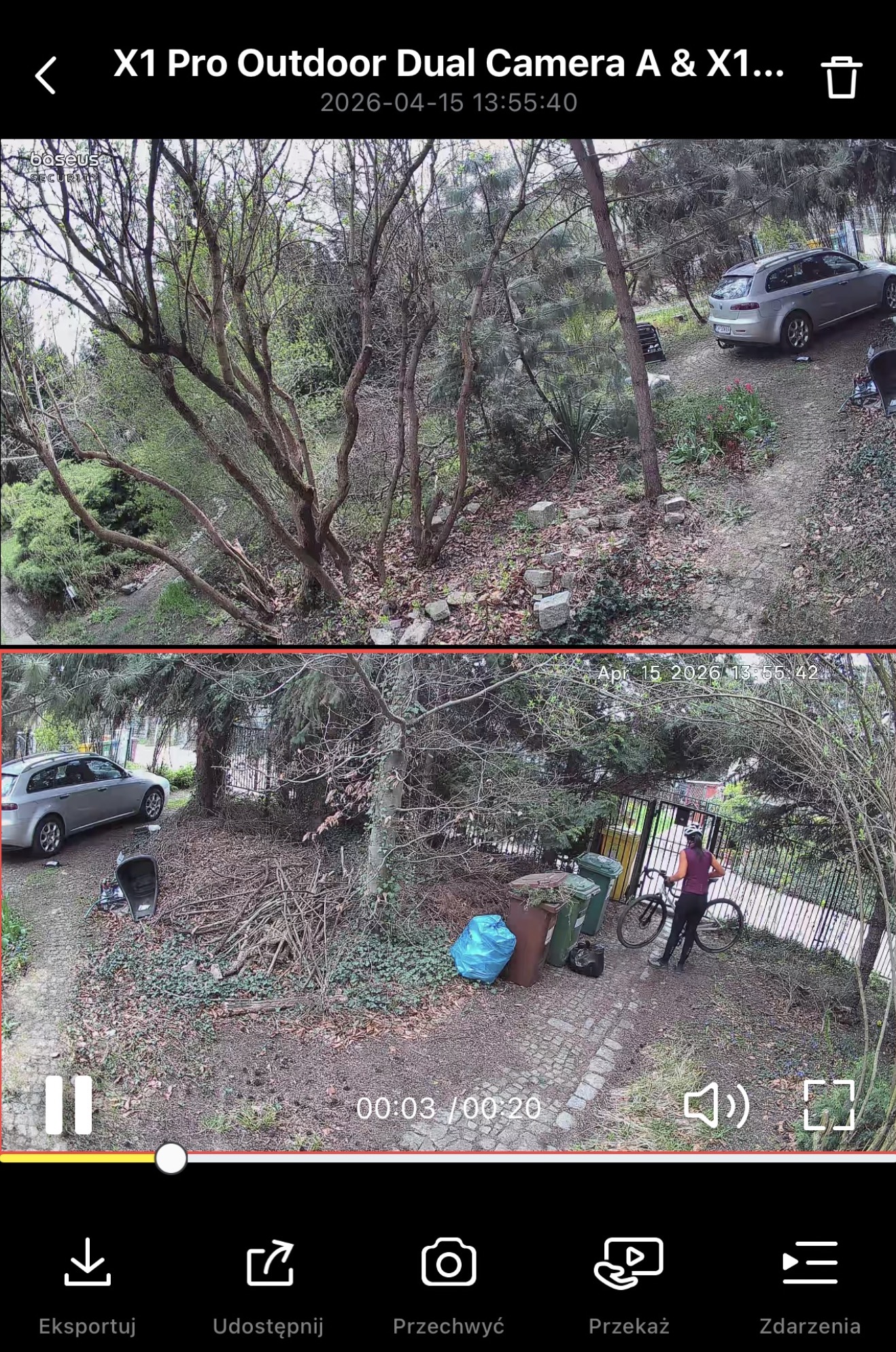 W 99 proc. przypadków. Przeglądając listę nagrań z ostatnich tygodni jestem w stanie znaleźć kilka, gdzie kamera dość późno zarejestrowała ruch i to z powodów kompletnie mi nieznanych. Przykładowo raz osoba przechodząca przez furtkę – która, jak widać, jest mocno w kadrze – została uchwycona dopiero w połowie ścieżki, bez wcześniejszego zapisu.