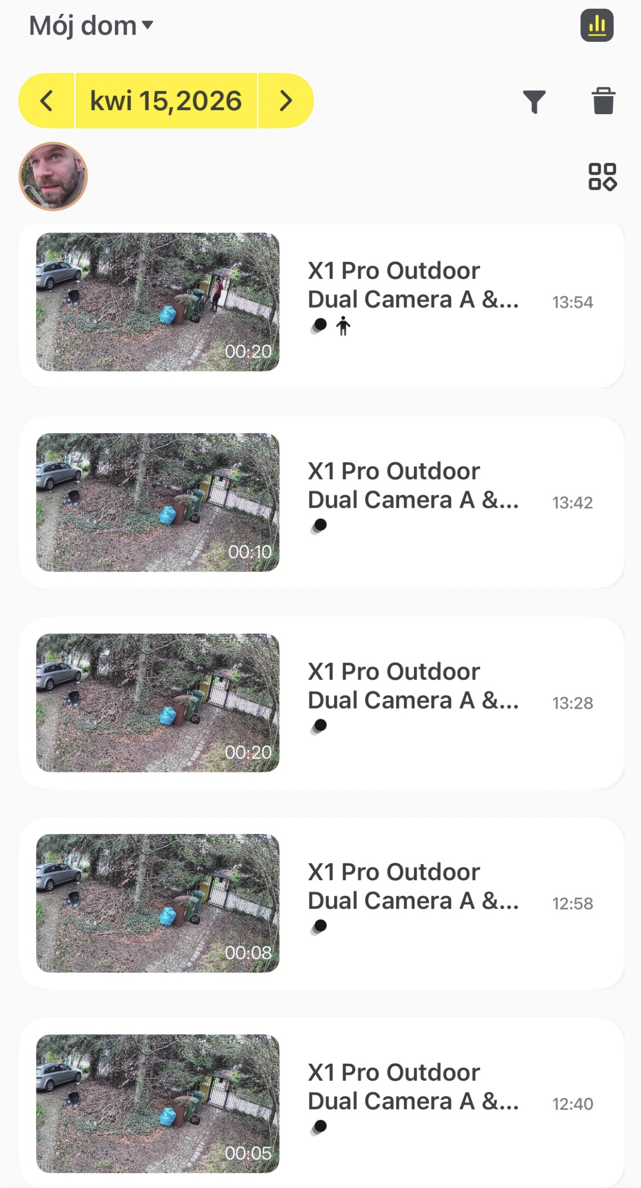 Powyżej widać przykładowo, iż tego dnia widziano mnie, a jeżeli przewinę listę zdarzeń w dół, taką samą ikonę znajdę dokładnie przy nagraniu, gdzie było mnie widać. Można to też wykorzystać np. do wyłączenia powiadomień „o sobie”, aczkolwiek nie zawsze działa to idealnie z powodów technicznych. Przykładowo, jeżeli wychodzę z domu, to jestem cały czas plecami do kamery (w obecnym ustawieniu), więc tak średnio ma szansę stwierdzić, iż to jestem ja.