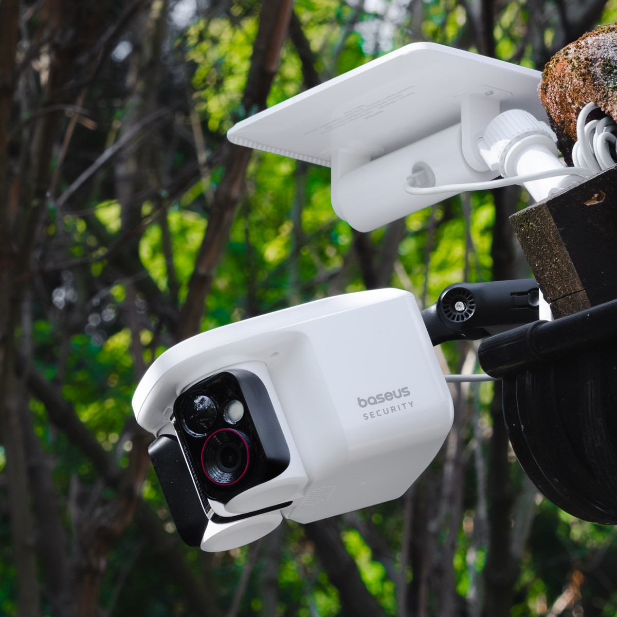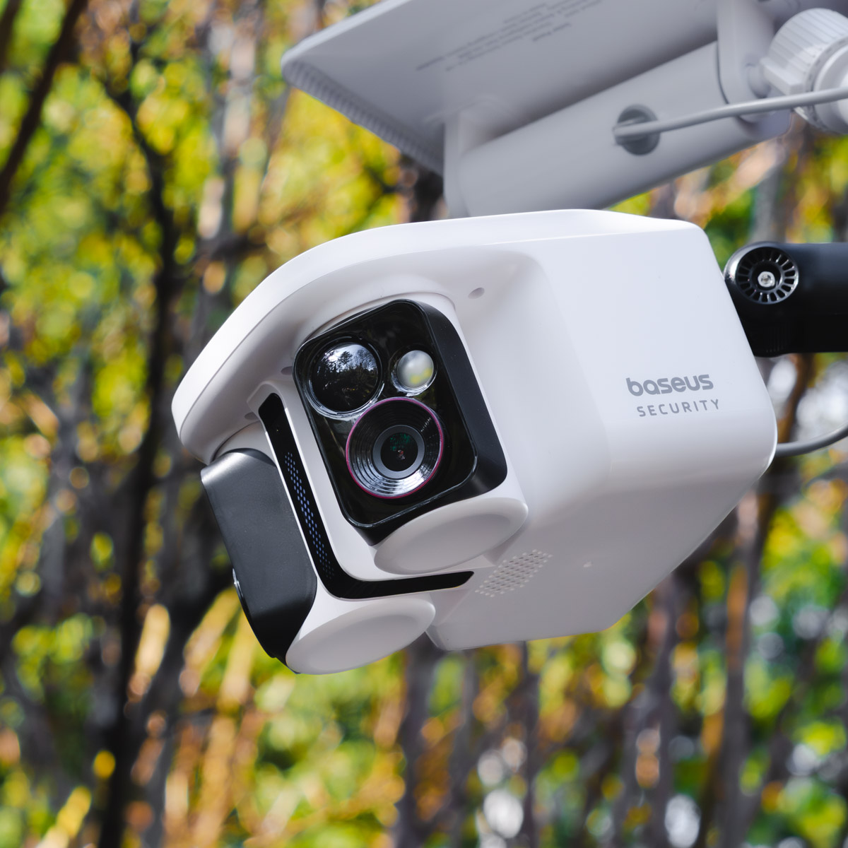 I która – jak widać po zdjęciu – jest tak naprawdę sprytnie pomyślanym zestawem dwóch kamer. Dokładniej – dwóch kamer (każda o rozdzielczości 3K), dwóch modułów doświetlających, panelu fotowoltaicznego i specjalnego uchwytu montażowego, który potrafi to wszystko połączyć w całość. Całość, która wygląda tak: