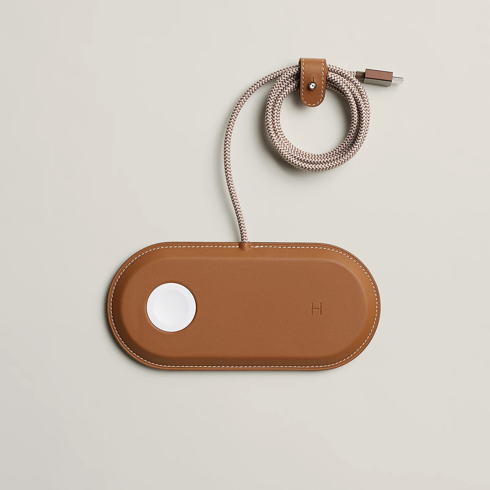 Hermès oferuje zestaw składający się z ładowarki Paddock Duo i skórzanego etui Grand Paddock wykonanego z cielęcej skóry Swift w kolorze Gold. Sama ładowarka ma dwie strefy MagSafe i według opisu producenta pozwala jednocześnie ładować dwa urządzenia: iPhone’a oraz AirPodsy albo Apple Watcha. Produkt jest wykonany we Francji i pozycjonowany jako akcesorium podróżne premium. Brzmi pięknie, prawda?