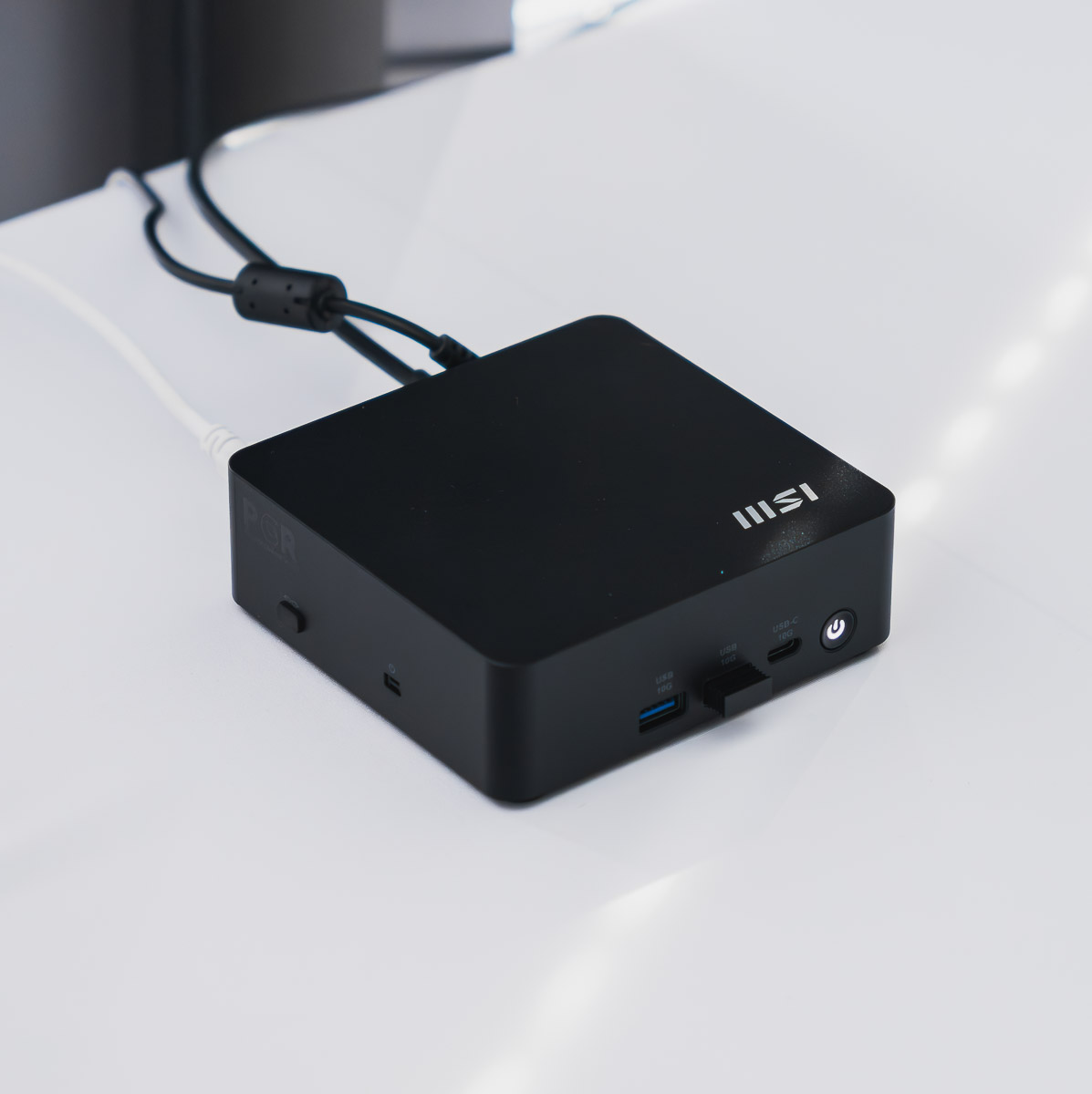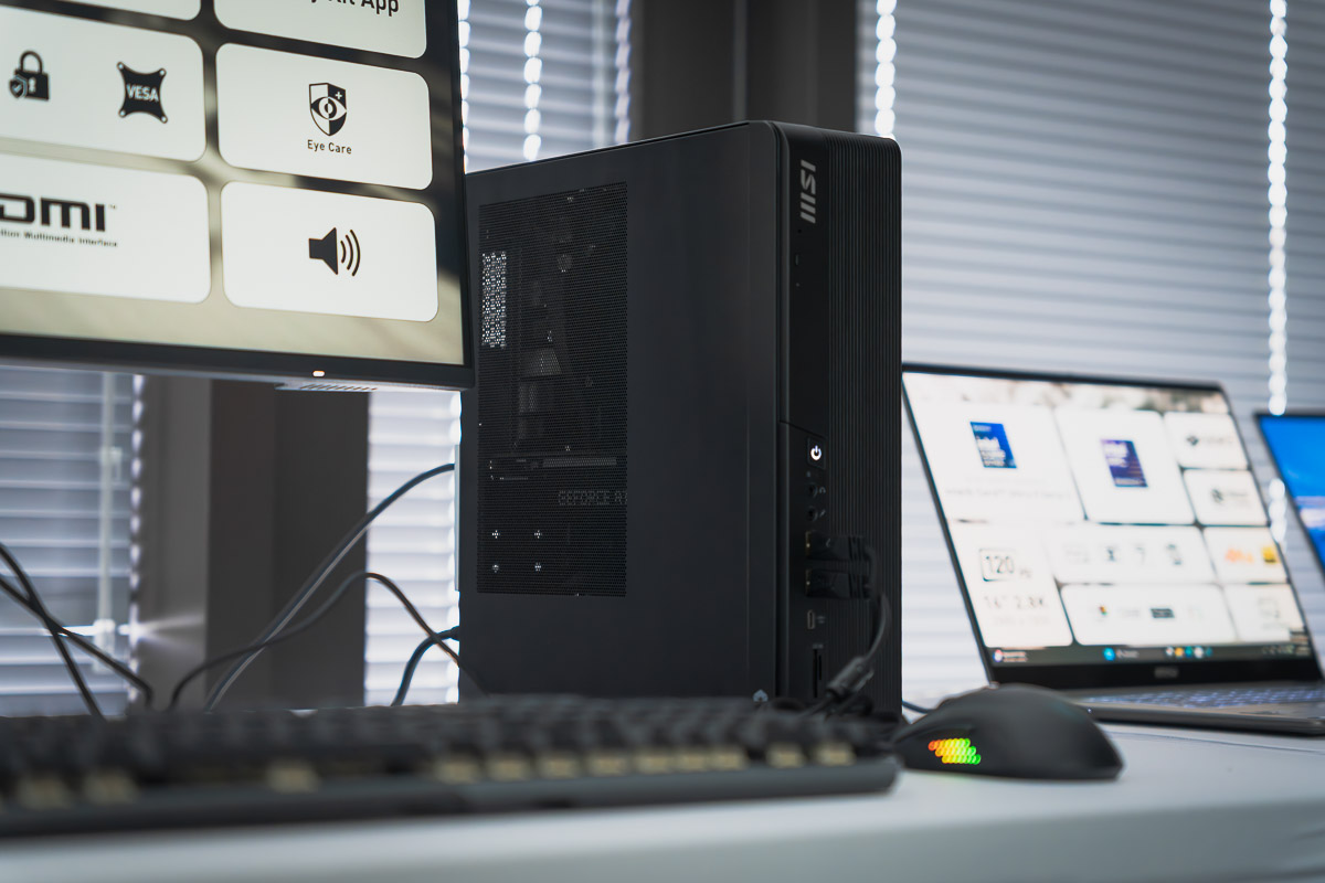 Pierwszym z nich, widocznym na zdjęciu powyżej, jest MSI Pro DP80, czyli komputer w obudowie SFF, oferujący 4 sloty DDR5, 2 złącza LAN 2,5 Gb/s, Thrunderblot 4, łatwą rozbudowę i dostęp do podzespołów oraz układy Intel Core Ultra 7 155H. Dostępnych konfiguracji jest multum, a i w razie czego każdy może wprowadzić modyfikacje według własnego uznania. Do środka – co zresztą widać na zdjęciu – zmieszczą się choćby niskoprofilowe karty graficzne, więc potencjał na pełnoprawny komputer do pracy albo na domowy serwer z ogromnym zapasem mocy jest spory.