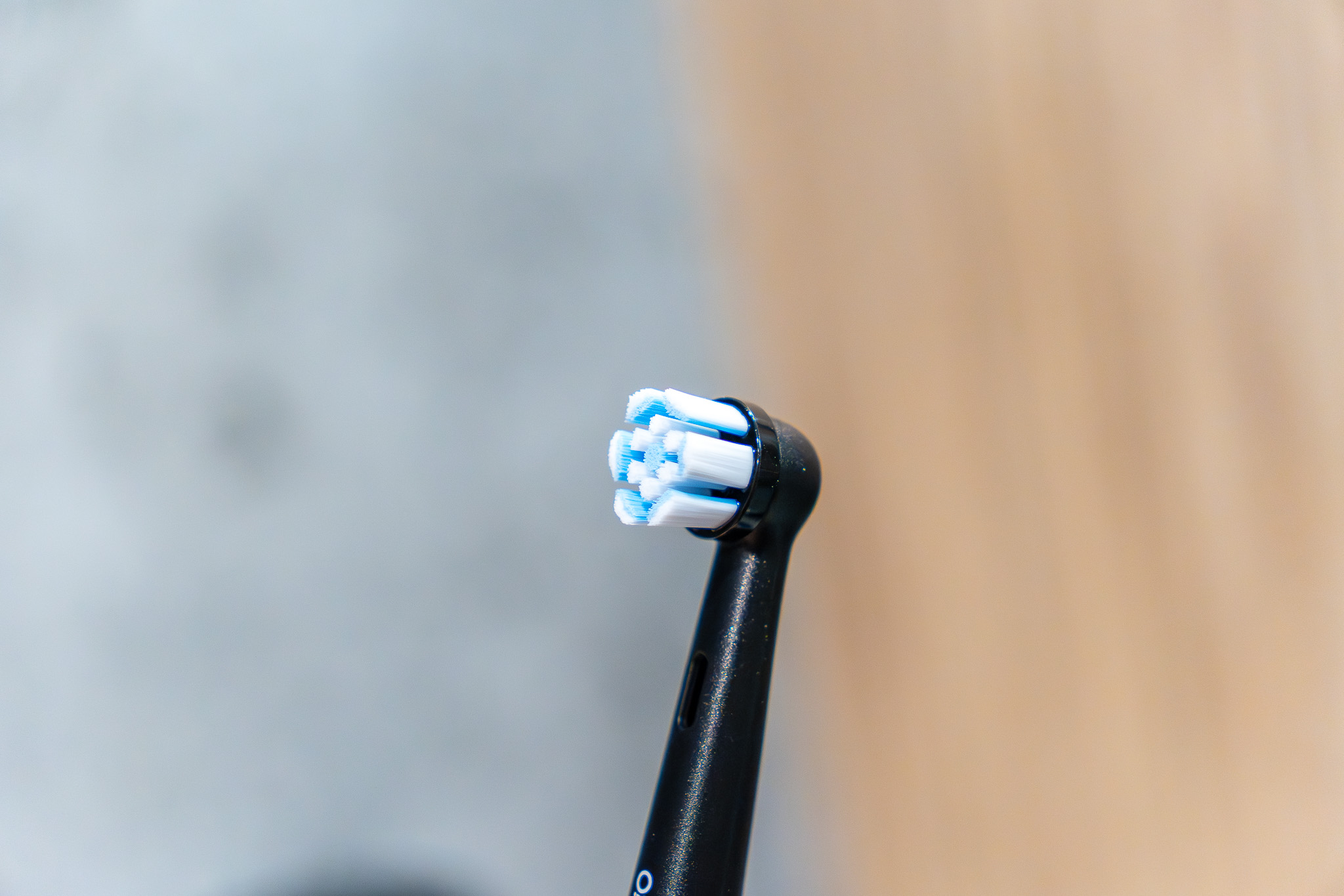 Do tego dochodzi kształt główki. Okrągła główka szczoteczki Oral-B iO otacza pojedynczy ząb z każdej strony, docierając do linii dziąseł i trudno dostępnych miejsc, których szczoteczka manualna może nie doczyścić. Badania porównawcze pokazują konkretny wynik: technologia iO usuwa do 100 proc. więcej płytki bakteryjnej niż szczoteczka manualna.