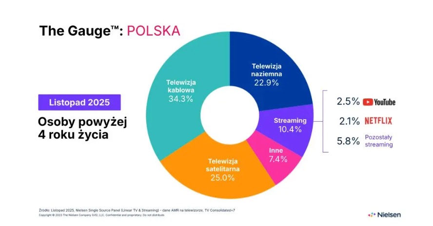 Z nowego badania The Gauge: Polska wynika, iż w listopadzie 2025 r. Polacy spędzili średnio 4 godz. i 5 min dziennie przed dużym ekranem. W porównaniu z wcześniejszym miesiącem wynik wydłużył się o 14 min. jeżeli porównamy czas z listopadem 2024 r., mówimy o 1 min więcej. Mimo wzrostu popularności VOD telewizja wciąż jest głównym źródłem rozrywki.
