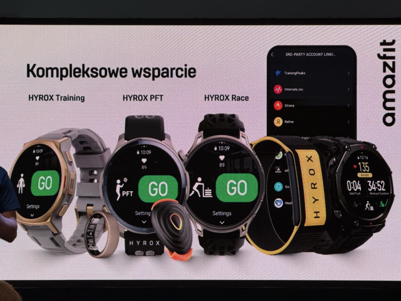 Hyrox Warsaw było okazją dla firmy Amazfit, by pochwalić się portfolio produktów. Te służą do rejestrowania aktywności zarówno podczas wyścigów Hyrox (w ramach trybu Race, który rejestruje każdą stację i strefy przejściowe), jak w trakcie treningów (w trybie Trening z harmonogram i analizami oraz spersonalizowanym trybie PFT; dostajemy dane protreningowe i regeneracyjne).