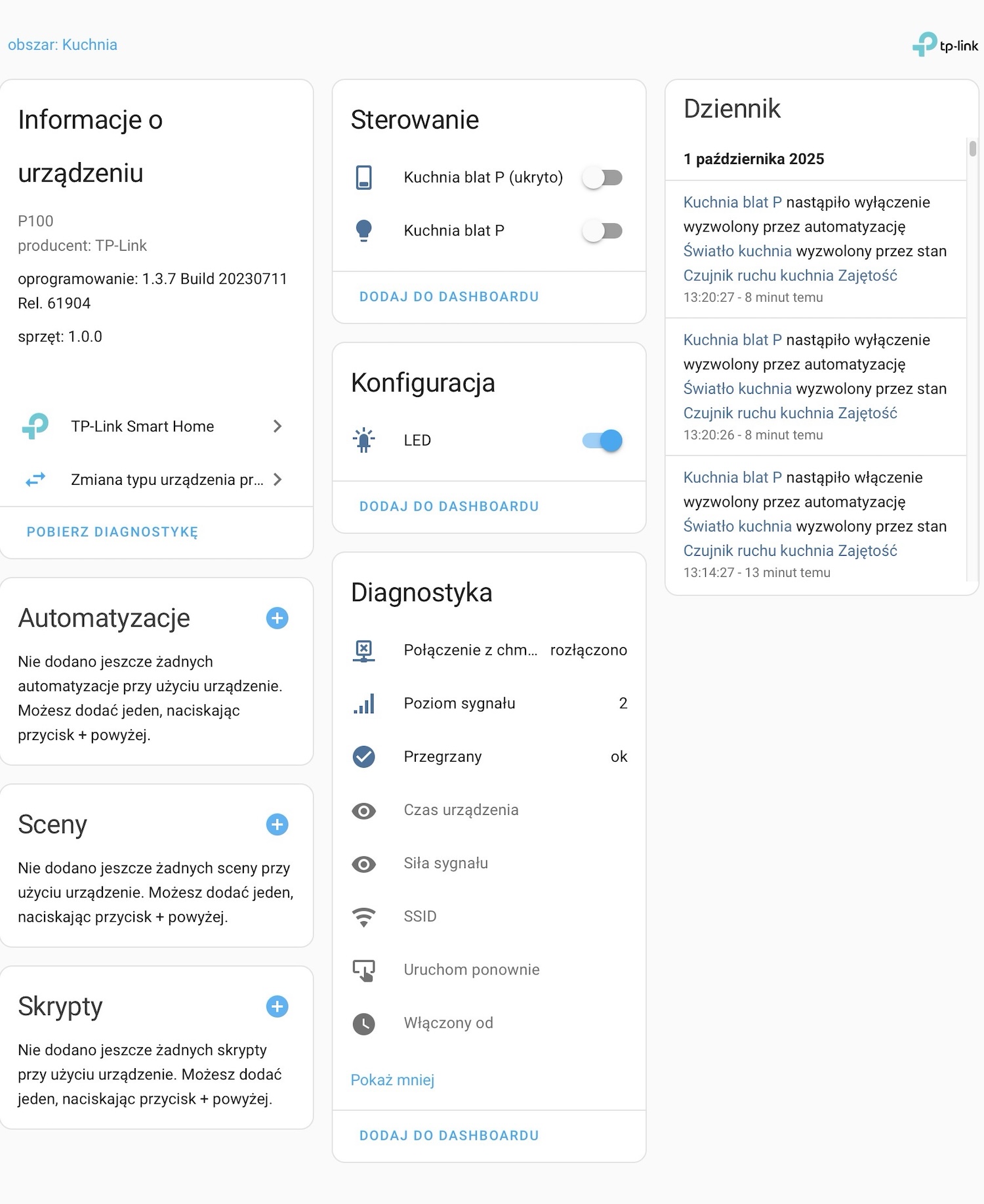 Mało? Teoretycznie tak, ale w praktyce jest to świetne rozwiązanie dla podstawowego sterowania urządzeniami, które nie mają innych stanów niż „włączony” i „wyłączony”. Przykładowo u mnie w kuchni do Tapo P100 podłączone są zasilacze kuchennych LED-ów, a te z kolei powiązane są z czujnikami ruchu w tym samym pomieszczeniu. Wykrycie ruchu aktywuje P100, a wtyczka włącza LED-y. Brak ruchu przez określony czas – sygnał dla P100, żeby te LED-y wyłączyć. Proste, bardzo wręcz podstawowe, ale i działające idealnie tak, jak trzeba.