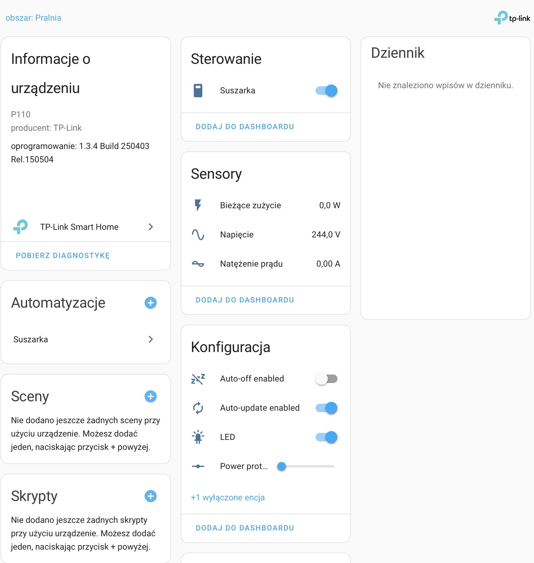 Przykład? W moim domu do P110 (i odmian – o tym za chwilę) podłączona jest m.in. pralka, suszarka i zmywarka. Prosty schemat w Home Assistant i połączenie całości z czujnikiem otwarcia na drzwiczkach sprawiają, iż mój system wie, kiedy trwa pranie/zmywanie/suszenie i jest mi w stanie wysłać powiadomienie w momencie, kiedy ten proces się zakończy. Pozwoliło mi to m.in. wyłączyć irytujące piszczenie po zakończeniu cyklu, zastąpione właśnie subtelną wibracją. I żeby było miło – po otwarciu drzwiczek stan urządzenia resetuje się aż do następnego uruchomienia.