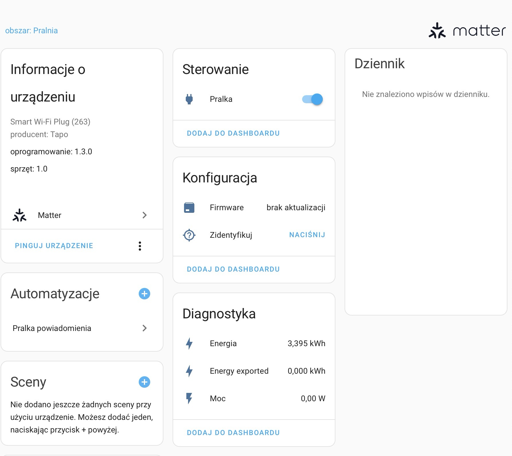 Powód? Oczywiście obsługa Matter, a co za tym idzie – fantastycznie bezproblemowa integracja z masą systemów smart dom, w tym używanym przeze mnie aktualnie Home Assistant. Na tym jednak się nie kończy, bo Tapo P110M wyróżnia się na tle innych przystępnych cenowo wtyczek tym, ze nie tylko oferuje Matter (ponownie – bez żadnej bramki), a też obsługuje Matter w wersji 1.3. To z kolei oznacza, iż możemy korzystać z Matter z funkcją pomiaru zużycia, co w przypadku podobnych wtyczek ze znanego sklepu meblowego na razie możliwe nie jest.