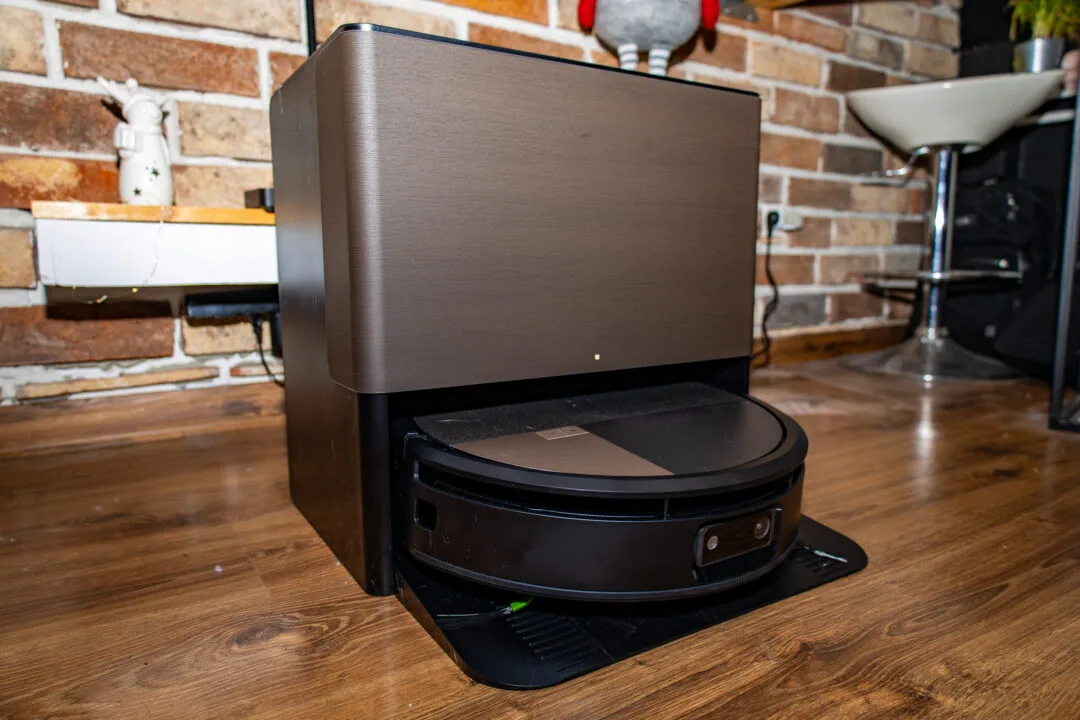 Porównanie z Roombą i5+Obok znajduje się osobna komora na detergent. Producent dołącza do zestawu własny płyn, który wlewa się bezpośrednio do stacji. Od tego momentu użytkownik nie musi się już tym zajmować – system sam dozuje odpowiednią ilość środka podczas mopowania. W praktyce działa to bezobsługowo i eliminuje jeden z bardziej irytujących elementów mopowania w tańszych robotach, gdzie trzeba pamiętać o dolewaniu płynu do zbiornika robota.