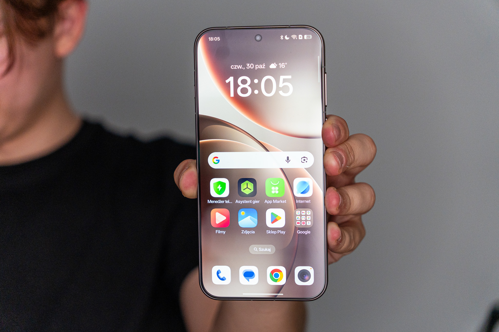 W dłoni leży pewnie – producent zadbał o ergonomiczny chwyt dostosowany do naturalnego ułożenia dłoni, z lekko zaokrąglonymi bokami ramki o grubości zaledwie 4,21 mm (dla porównania iPhone 16 Pro Max ma 4,35 mm). Jakość spasowania poszczególnych elementów nie pozostawia absolutnie żadnych złudzeń co do segmentu cenowego, w który celuje producent.
