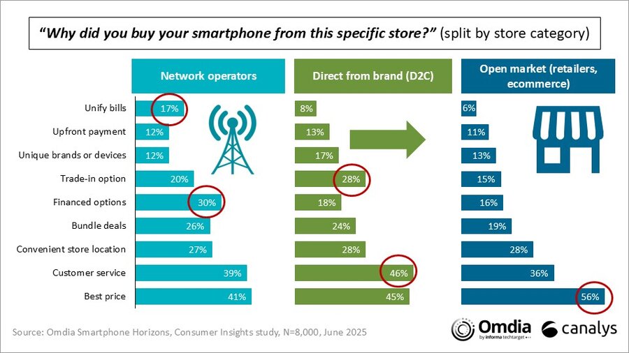 Łącznie pięciu największych producentów odpowiadało za rekordowe 87% udziału w rynku, co pokazuje rosnącą koncentrację i znaczenie silnych marek. Konsumenckie badania Canalys wykazały, iż Europejczycy coraz chętniej kupują telefony bezpośrednio od producentów (D2C), szukając wsparcia i kontaktu z marką, podczas gdy otwarte kanały rynkowe przyciągają głównie niską ceną. Operatorzy telekomunikacyjni przez cały czas odgrywają istotną rolę, m.in. promując telefony z 5G i eSIM.