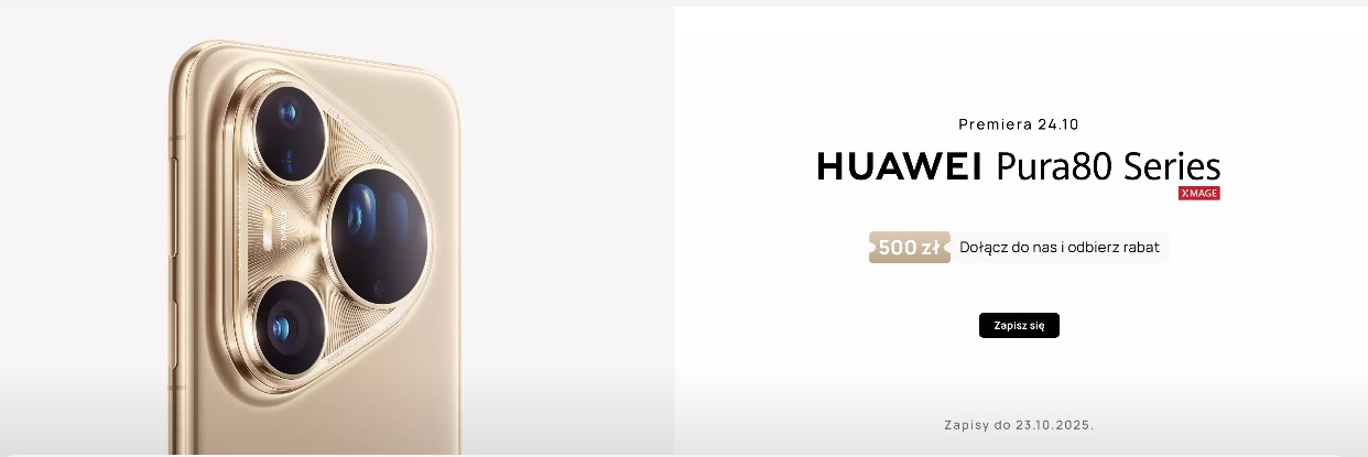 Premiera telefonów Huawei Pura 80 w Polsce została zaplanowana na 24 października 2025 r. Aby urządzenia były jeszcze bardziej atrakcyjne, firma rozdaje kupony o wartości 500 zł. Aby je otrzymać, trzeba będzie wykonać jeden krok – zapisać się do newslettera (listy mailingowej) do 23 października.