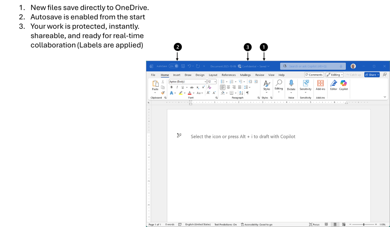 Twoja praca jest chroniona od pierwszego wprowadzonego znaku, gotowa do udostępniania i współpracy w czasie rzeczywistym. Microsoft wprowadził nowy model tworzenia plików w Wordzie na Windows. Teraz gdy otworzysz aplikację i klikniesz Nowy dokument, Word automatycznie ustawi OneDrive jako domyślne miejsce zapisu. I będzie prowadził zapis w czasie rzeczywistym, by absolutnie nic nie umknęło w razie problemów.