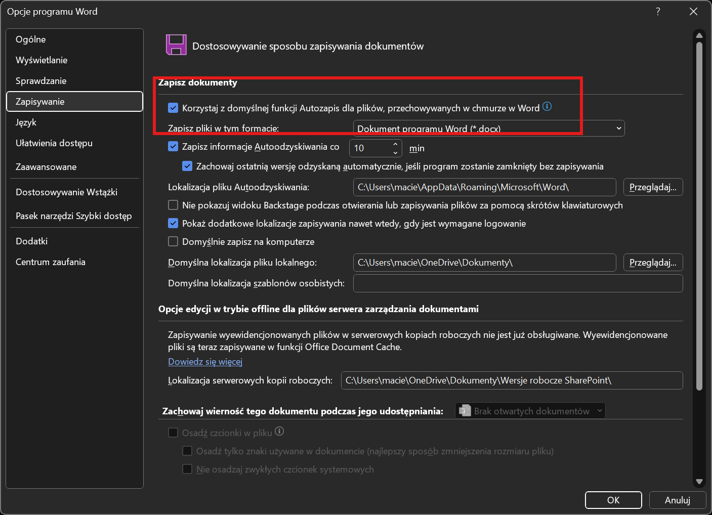 Aby włączyć domyślny autozapis, wystarczy być zalogowanym na swoje Konto Microsoft w Wordzie i upewnić się, iż na OneDrive jest wolne miejsce. Mechanizm można włączać i wyłączać w menu Plik > Opcje > Zapisywanie. Upewnij się, iż zaznaczona jest funkcja Korzystaj z domyślnej funkcji Autozapis dla plików przechowywanych w chmurze w Word.