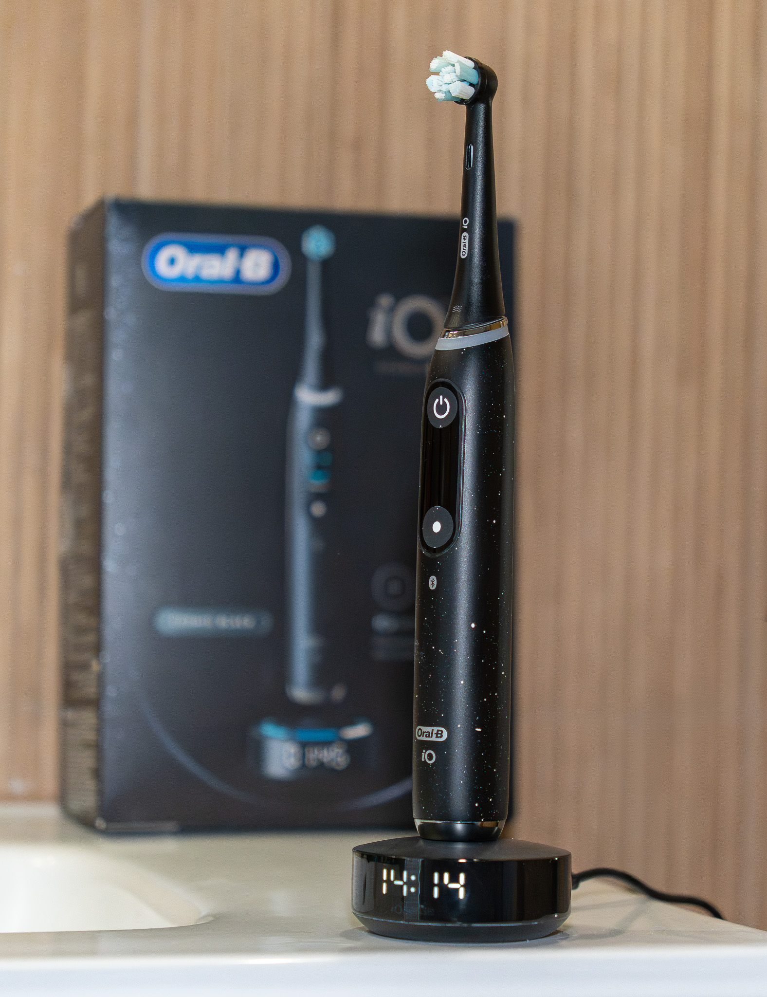 Zaawansowane modele, takie jak Oral-B iO10, oferują dodatkowo inteligentną ładowarkę iO Sense, która na co dzień służy jako stabilna podstawa. Baza ta nie tylko uzupełnia energię w akumulatorze, ale na bieżąco przekazuje spersonalizowane wskazówki, podpowiadając w jaki sposób i gdzie dokładnie należy szczotkować zęby. Na jej froncie znajduje się czytelny zegar odliczający czas mycia. To wygodne rozwiązanie, za pomocą którego wszystkie najważniejsze dane są widoczne bez potrzeby sięgania po telefona.