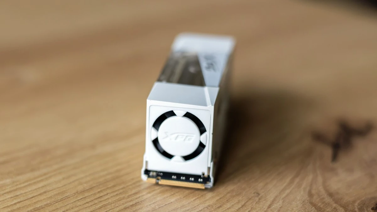 Chłodzenie dysku XPG Mars 980 Storm 2 TB nie wymaga żadnego zewnętrznego zasilania – wentylatory są zasilane bezpośrednio z portu M.2 i pracują półpasywnie (uruchamiają się dopiero przy wzroście temperatury). Całość wygląda masywnie, ale mieści się w standardowym slocie M.2 i nie koliduje z kartami graficznymi.