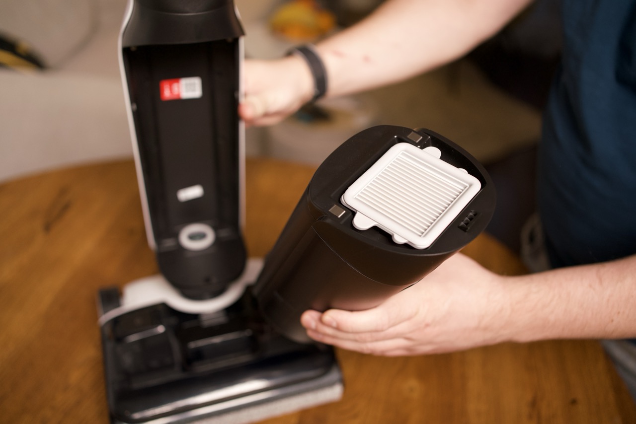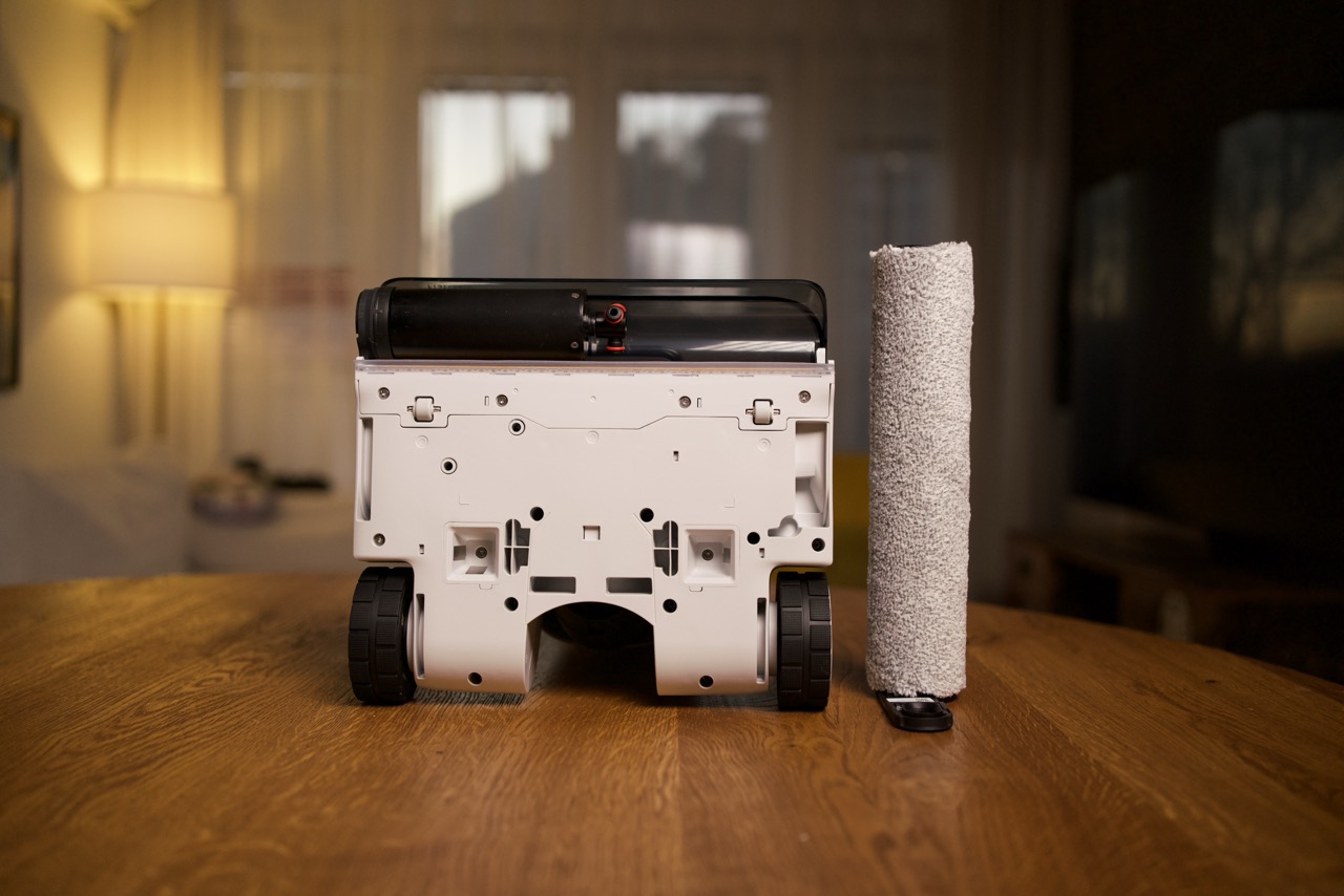 W urządzeniu zamontowano również wałek wykorzystujący technologię podwójnych skrobaków JawScrapers do usuwania drobnych zanieczyszczeń i włosów, zapobiegając ich nawijaniu, co, jako właściciel kocurów z długim futrem, doceniam. Wałek dociskany jest z kolei, przy napełnionym zbiorniku, z mocą 20 N, co pomaga w usuwaniu zabrudzeń bez wielokrotnego przejeżdżania po tej samej powierzchni.
