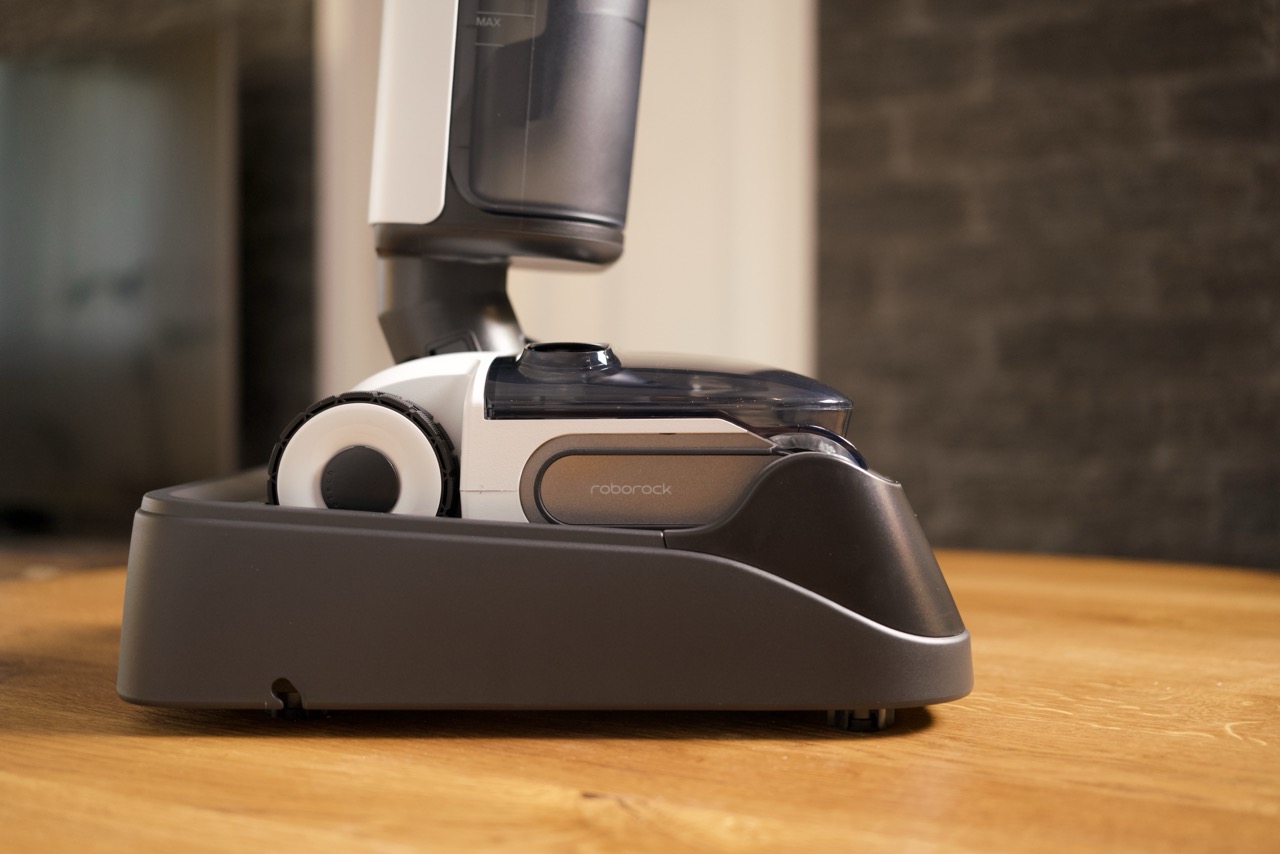Oprócz tego w smukłej obudowie modelu Roborock F25 Ace znalazło się miejsce na dwa zbiorniki na wodę – czystą i brudną o pojemności odpowiednio 870 i 720 ml. Co istotne, umieszczono je w dolnej części urządzenia, co obniża jego środek ciężkości, a to dodatkowo ułatwia prowadzenie go po podłodze. Nie muszę przy tym ich napełniać i opróżniać po każdym kursie, tylko mniej-więcej raz w tygodniu.