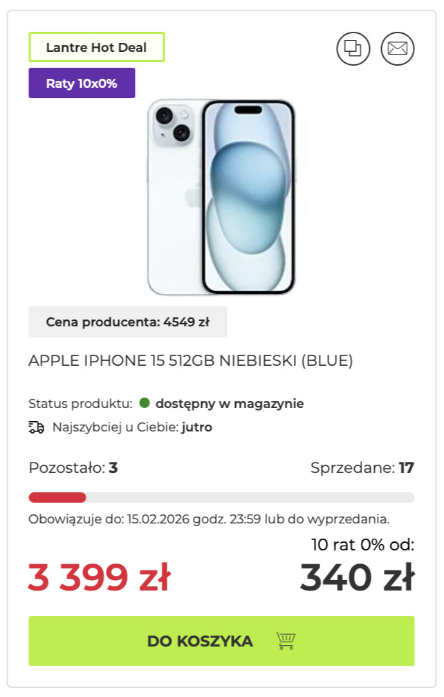 iPhone 15, 512 GB, niebieski: 4549 zł -> 3399 zł