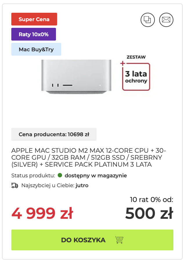 Mac Studio z M2 Max, 32 GB RAM, 512 GB SSD + Service Pack Platinum 3 lata: 10698 zł -> 4999 zł