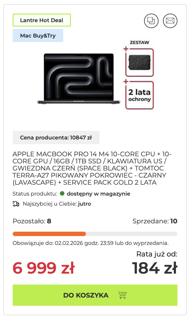 MacBook Pro 14″ z M4, 16 GB RAM, 1 TB SSD + pokrowiec TomToc + Service Pack Gold 2 lata: 10847 zł -> 6999 zł