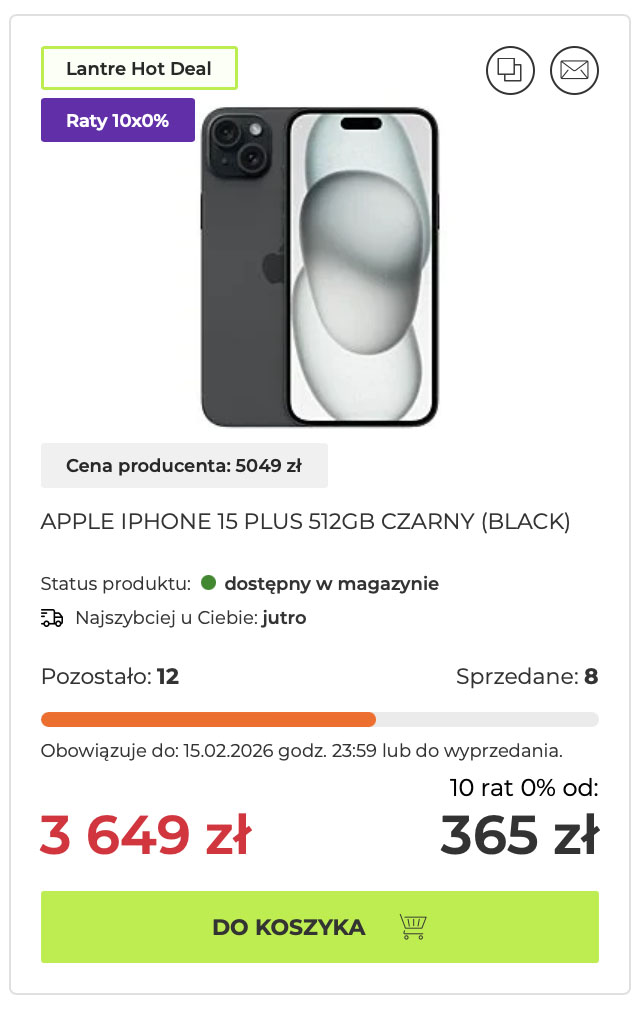 iPhone 15 Plus, 512 GB, czarny: 5049 zł -> 3649 zł