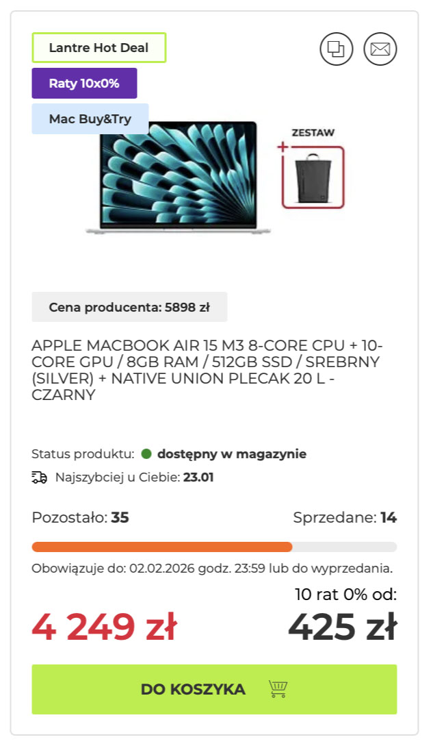 MacBook Air 15″ z M3, 8 GB RAM, 512 GB SSD + plecak Native Union : 5898 zł -> 4249 zł