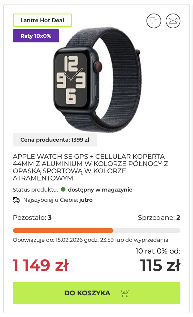 Apple Watch SE, GPS + Cellular, 44 mm: 1399 zł -> 1149 zł