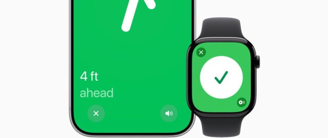Funkcja Znajdowanie dokładne może wskazać dokładną lokalizację przedmiotu z przymocowanym AirTagiem, wyświetlając strzałkę kierunkową i odległość od przedmiotu na kompatybilnym iPhonie, a teraz również na kompatybilnym zegarku Apple Watch.
