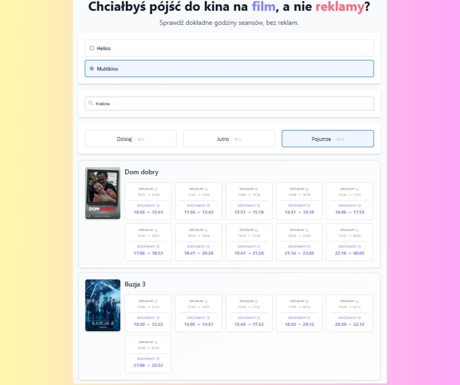 Właśnie na tej podstawie powstała strona kinobezreklam.org, która pokazuje realną godzinę rozpoczęcia filmu. To narzędzie społecznościowe, które może oszczędzić wiele nerwów i pozwolić zaplanować przyjście do sali kinowej dokładnie na czas.