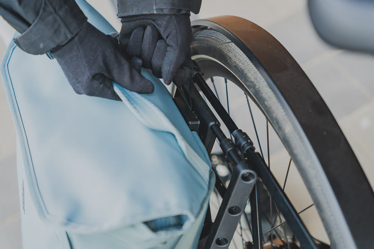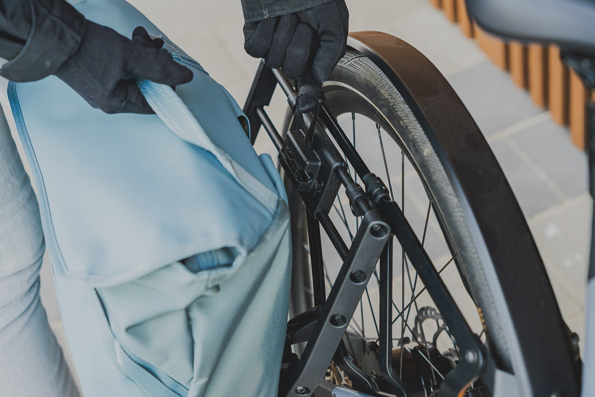 I po prostu nakładamy na to „U” odpowiednie wycięcia w płaskiej ściance sakwy czy torby. Potem zostaje popchnąć „U” aż kliknie i już – gotowe.