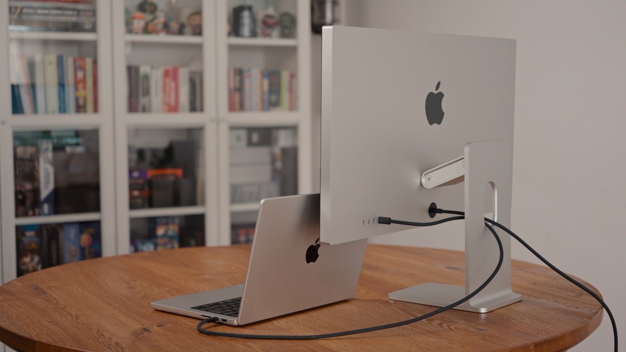 Dwa monitory Studio Display można podpiąć do MacBooka jednym przewodemOprócz tego bezpośrednio w monitor można wpiąć na stałe akcesoria, takie jak mikrofony czy szybkie dyski zewnętrzne, a jedyne, do czego mógłbym się tu przyczepić, to brak możliwości odpięcia od obudowy kabla zasilającego, co jest możliwe z kolei w komputerach typu all-in-one od Apple’a, czyli w iMakach. jeżeli przewód się uszkodzi, to czeka nas serwis.