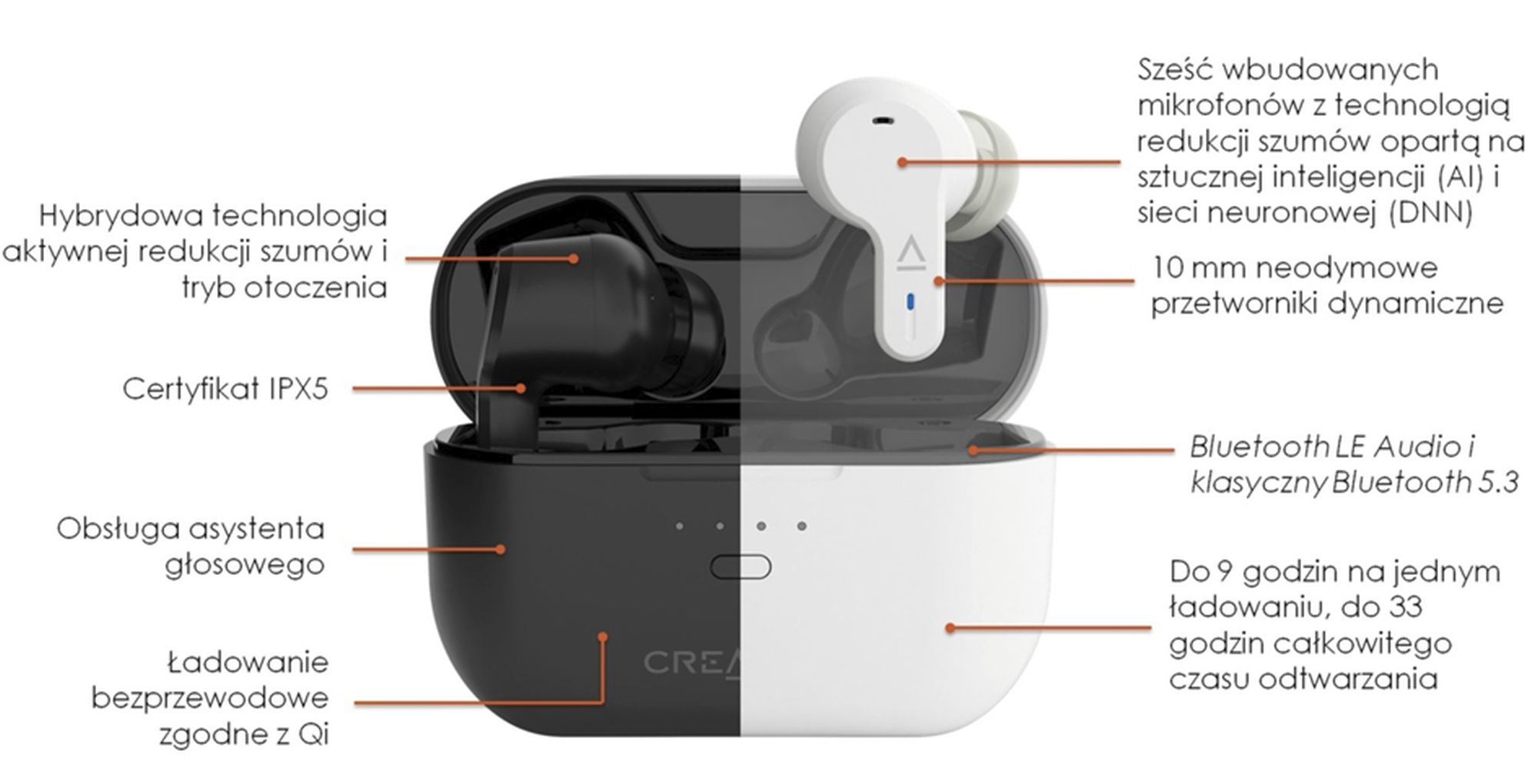 Nowy model to pokaz możliwości inżynierów Creative w segmencie budżetowym. Słuchawki wyposażono w 10-milimetrowe przetworniki dynamiczne oraz Bluetooth 5.3, ale to wsparcie dla standardu LE Audio jest tu kluczowe.