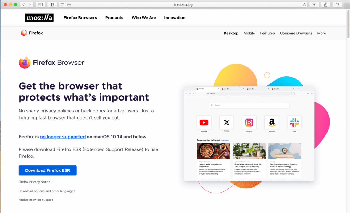 Firefox 115 ESR to ostatnia wersja przeglądarki wspierająca starsze systemy Windows i niektóre stare wersje macOS (10.12–10.14). Pozwala użytkownikom korzystać z internetu, oferując jednocześnie regularne poprawki bezpieczeństwa. To szczególnie istotne w obliczu rosnącej liczby zagrożeń online. Użytkownicy nowszych systemów np. Windows 10 lub macOS 10.15 i późniejsze, mogą korzystać z kolei z najnowszej wersji Firefox 148.
