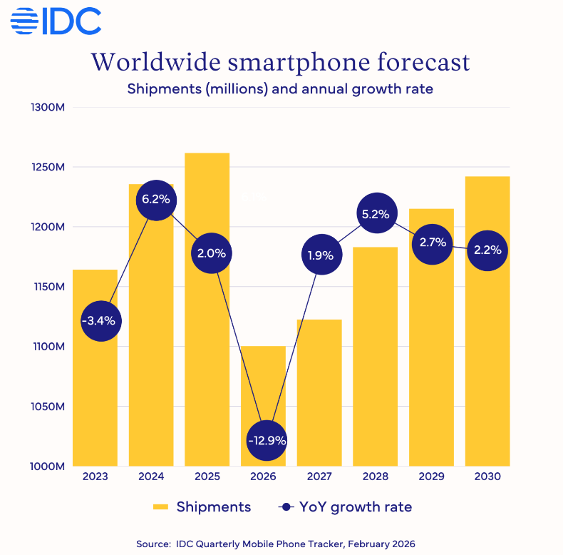 Globalny rynek telefonów czeka silne tąpnięcie. Według najnowszej prognozy IDC w 2026 roku sprzedaż spadnie o 12,9%, do 1,12 mld urządzeń. To najniższy poziom od ponad dekady, a główną przyczyną jest bezprecedensowy niedobór pamięci.
