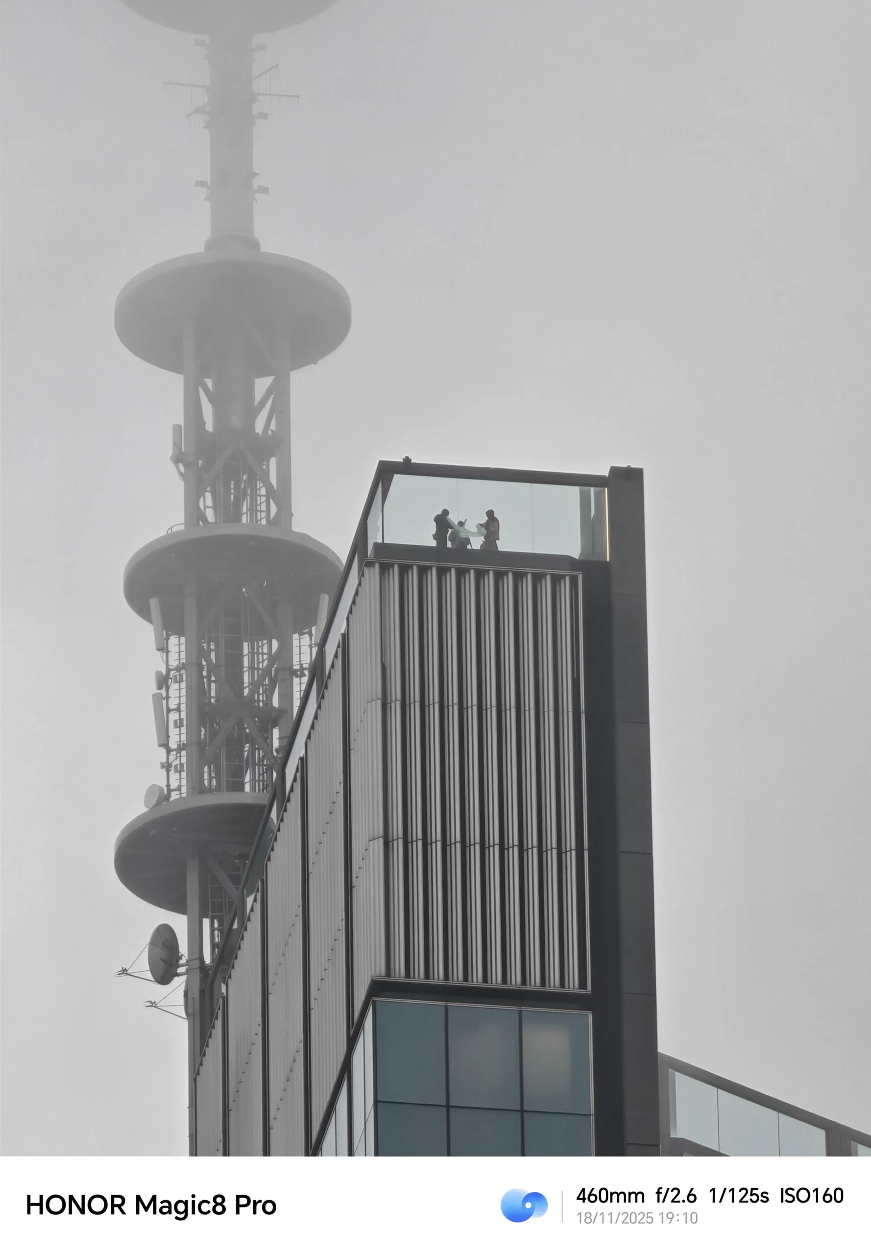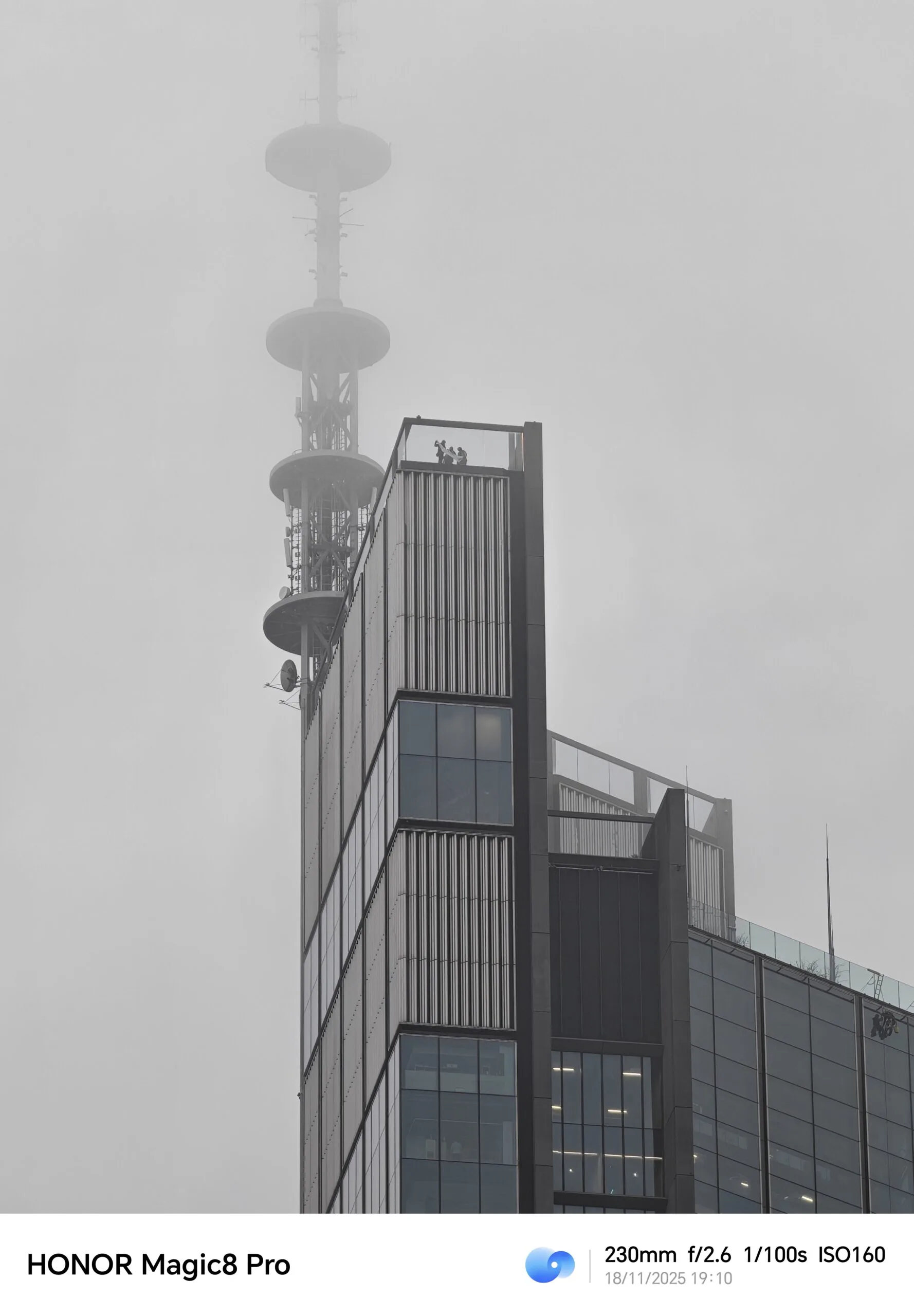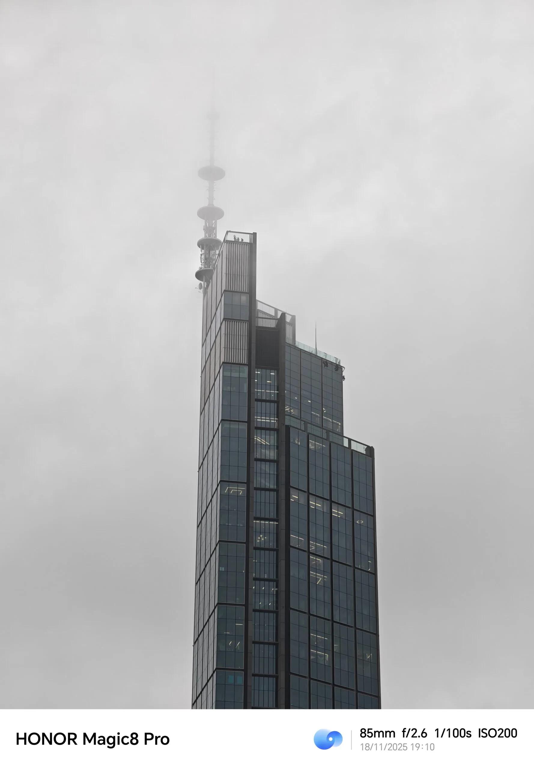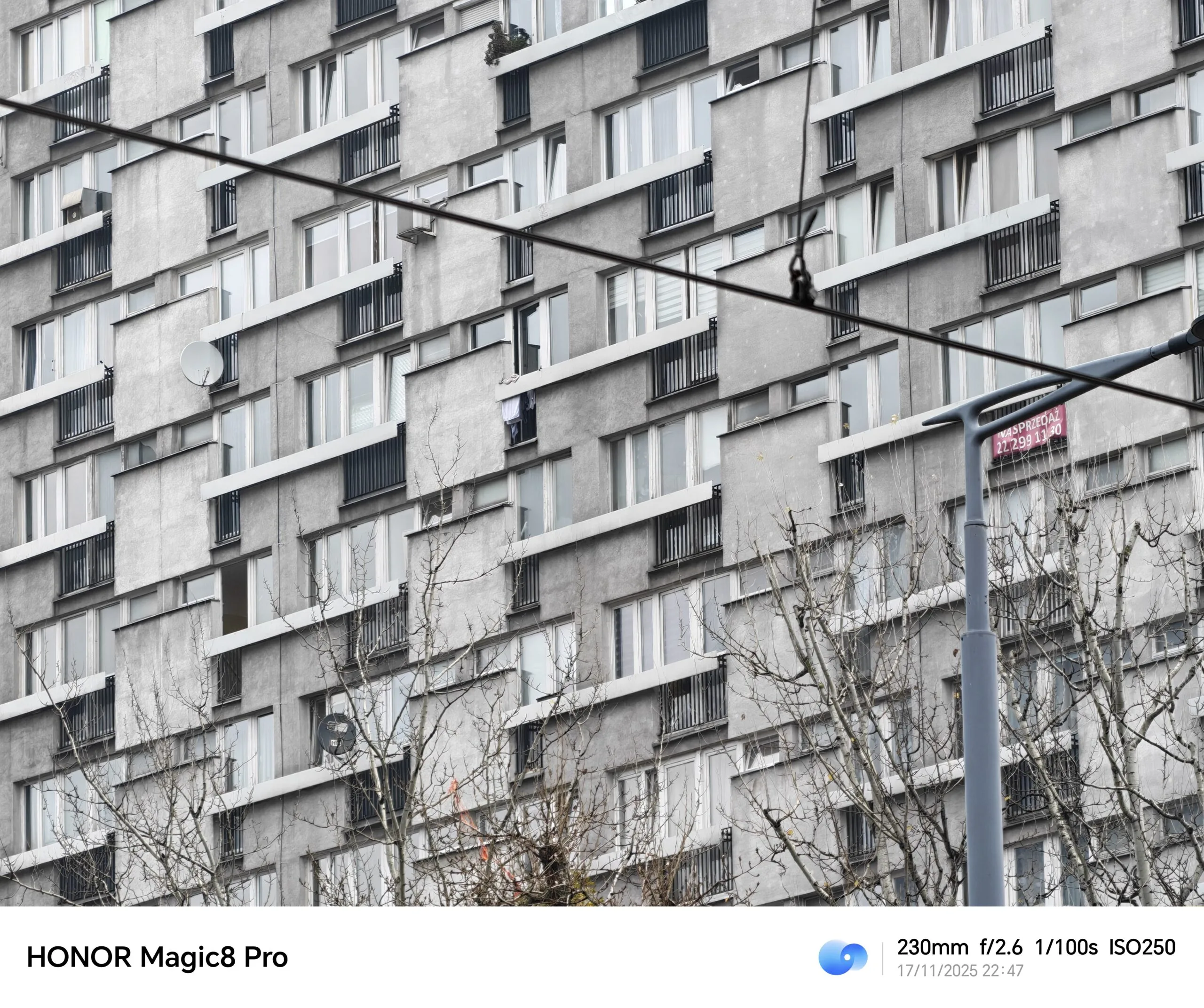 Oczywiście dziesięciokrotne zbliżenie nie jest dla HONORa Magic8 Pro limitem, bo zoomując, możemy dojść choćby do cyfrowego zbliżenia 100x. Fotografie wykonane przy zoomie większym niż 10x są mało praktyczne, ale na pewno pozwalają dostrzec detale niewidoczne gołym okiem, tak jak drabinę znajdującą się na dachu poniższego wieżowca.