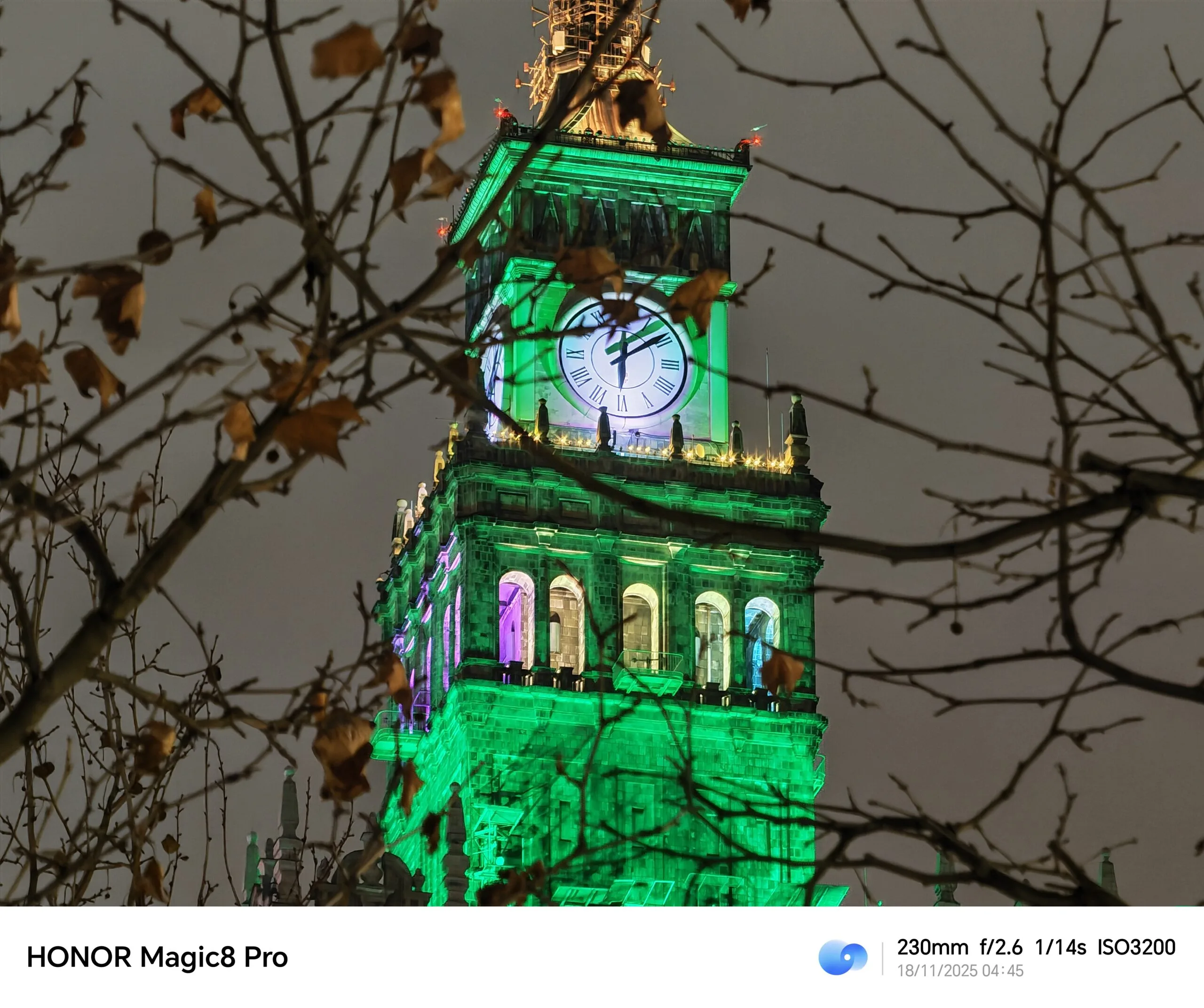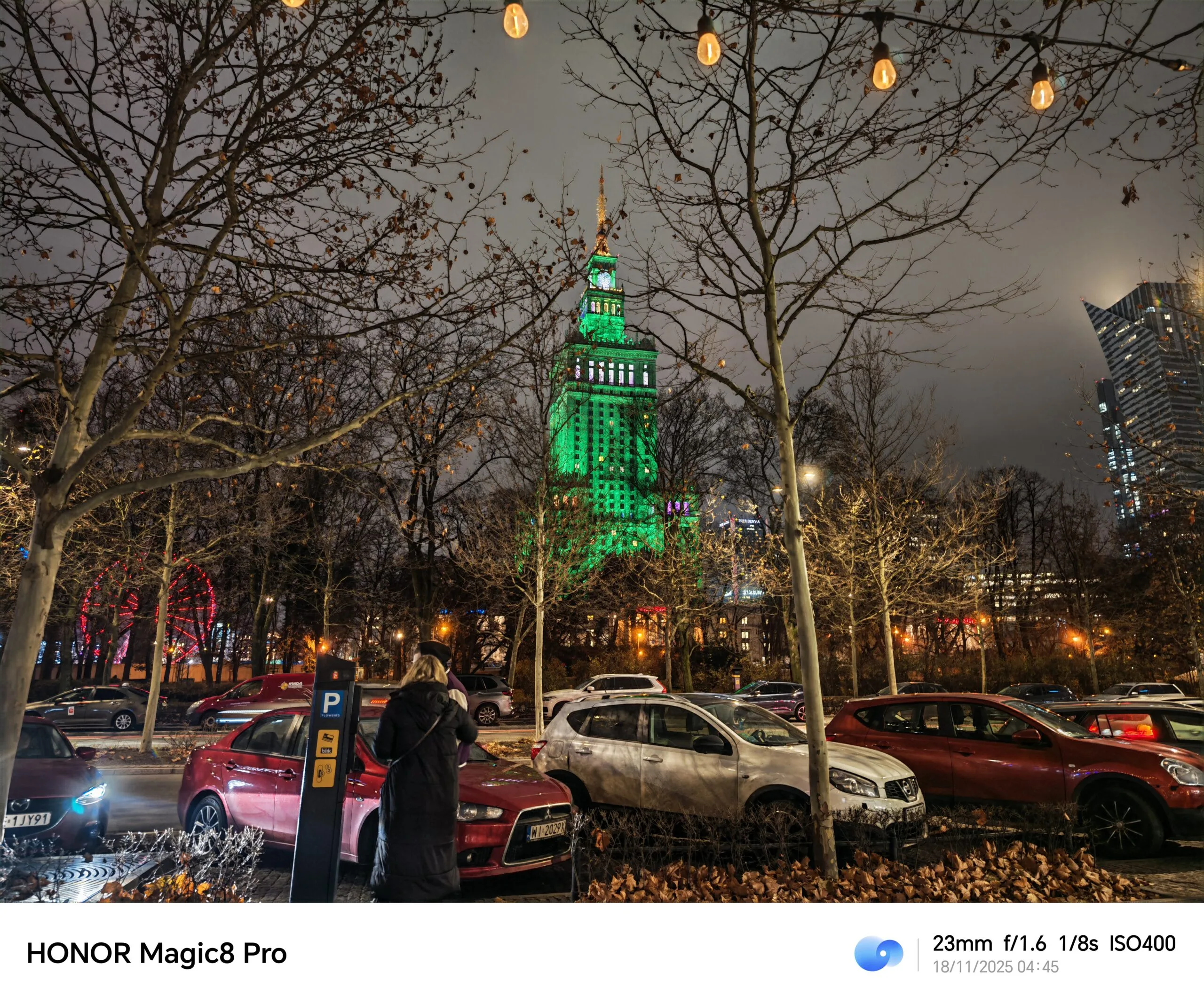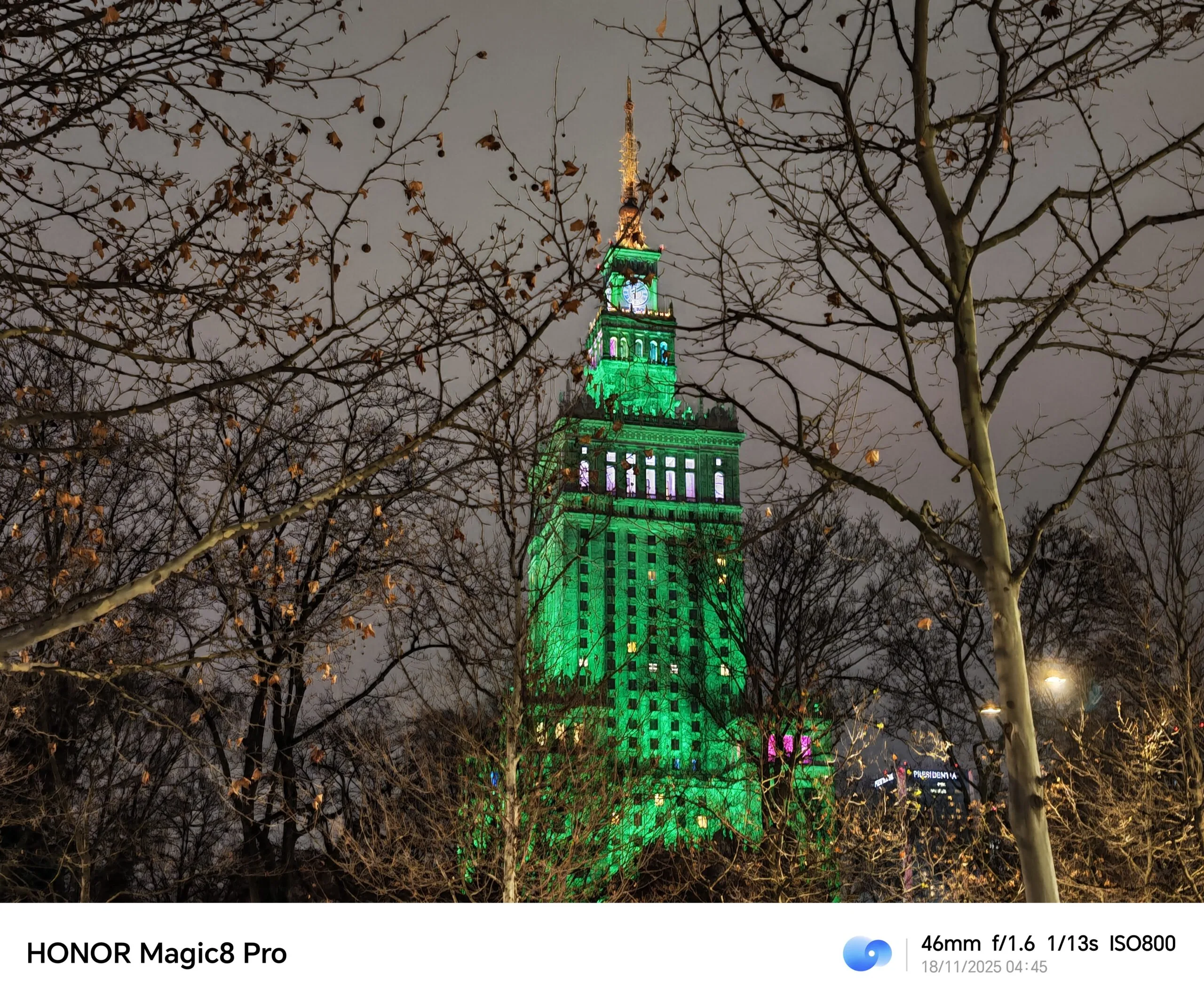 Szerzej na temat fotograficznych możliwości tego urządzenia rozpiszę się w pełnej recenzji, ale już teraz mogę powiedzieć, co robi tu wrażenie, a wrażenie na pewno robi teleobiektyw, oddający w nasze ręce zoom optyczny 3,7x i bazujący na matrycy 200 MP. Spójrzcie chociażby na uchwycony w zbliżeniu, podświetlony na zielono Pałac Kultury i Nauki. Także hybrydowe zbliżenie 10x wypada tu dobrze (choć już widać, iż majstruje przy nim AI). Z pewnością sprawdzę jeszcze, jak ten aparat radzi sobie z portretami.
