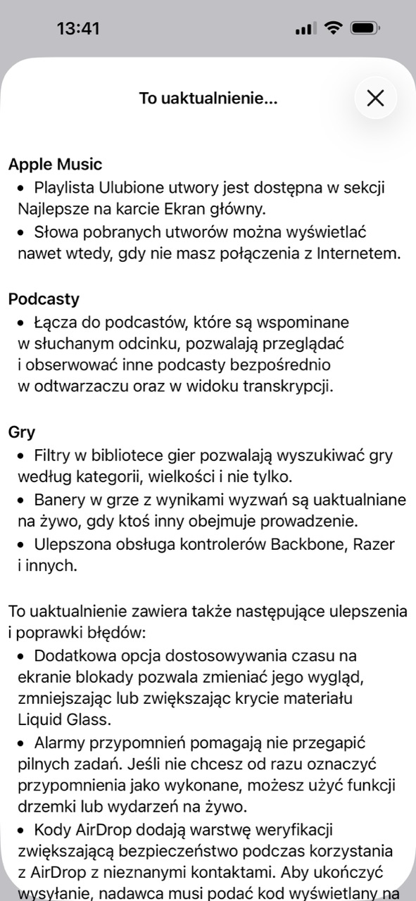 To dość nietypowe, ponieważ gigant przyzwyczaił nas do aktualizacji w poniedziałki o godz. 19:00 (lub trochę później). Nowe uaktualnienie nie przynosi rewolucji, ale za to kilka przydatnych nowości. Najlepsze to możliwość usunięcia Liquid Glass z ekranu blokady, alarmy dla przypomnień oraz tłumaczenie na żywo w Unii Europejskiej.
