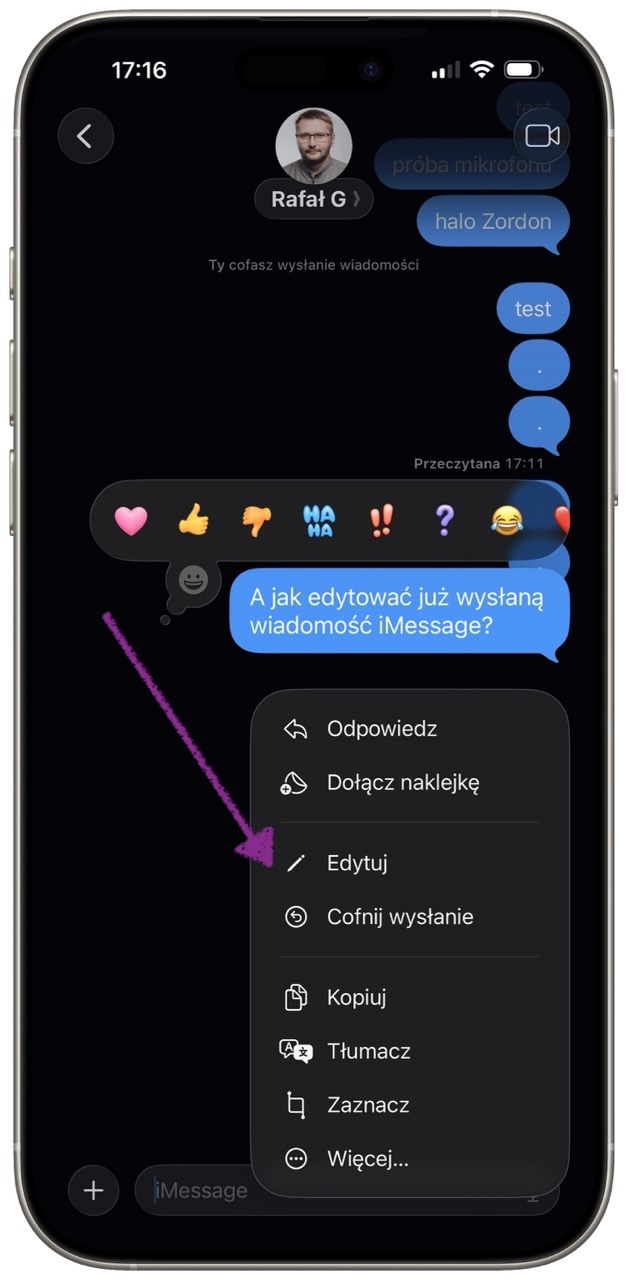 Aby edytować wiadomość iMessage na iPhonie, trzeba przytrzymać na niej dłużej palec