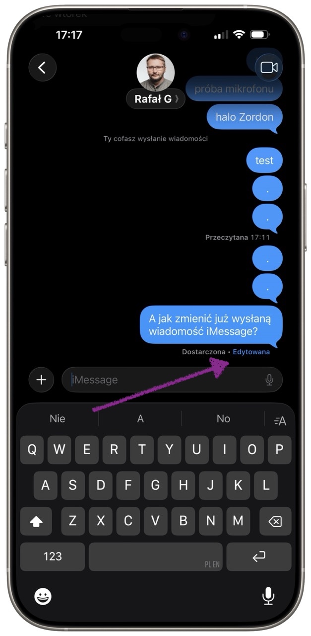 Można również podejrzeć, jaka była treść wiadomości iMessage przed edycjąEdytowanie wiadomości można znaleźć w tym samym menu kontekstowym, w którym znajduje się przycisk „Cofnij wysłanie”, które wyświetla się po przytrzymaniu palca na dymku (iOS, iPadOS, watchOS) lub kliknięcia w niego prawym przyciskiem myszy (macOS). Trzeba jednak pamiętać o tym, iż druga osoba może podejrzeć, jaka była treść wiadomości przed edycją. jeżeli nie chcemy, by np. odbiorca wiedział, jakiego babola zrobiliśmy, to lepiej wiadomość usunąć i napisać jeszcze raz.