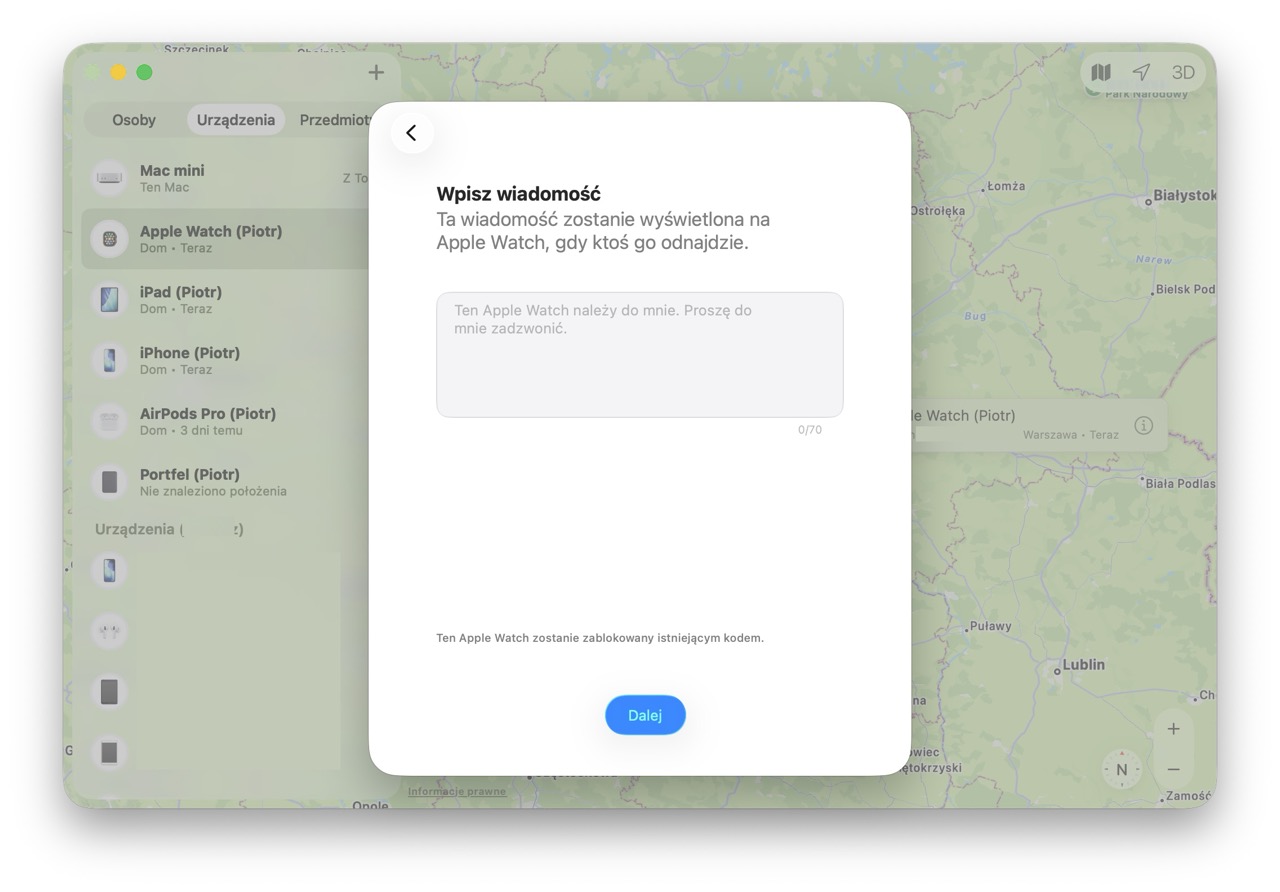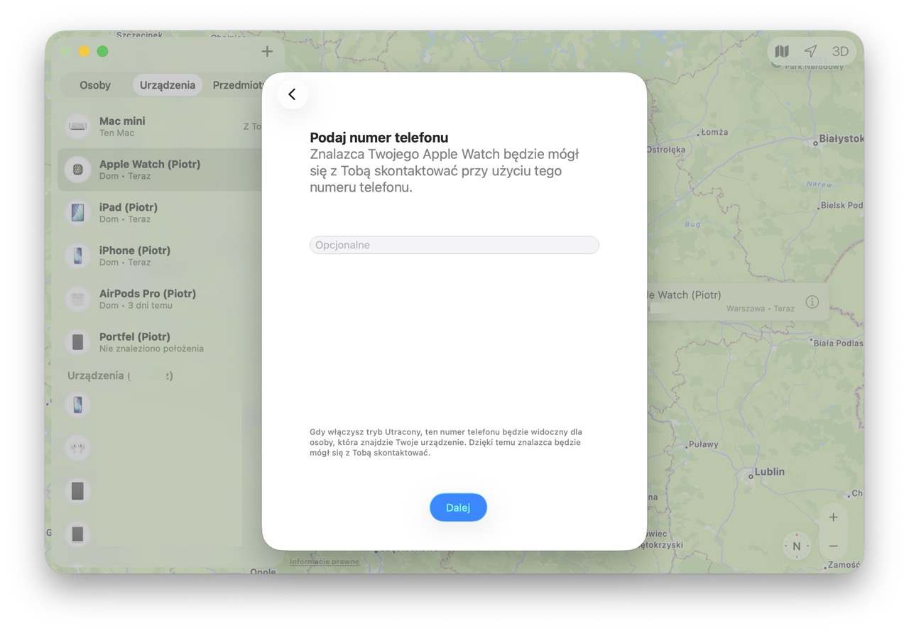 Na koniec wystarczy potwierdzić Tryb Utracony dla danego urządzeniaOprócz tego niektóre sprzęty Apple’a można zdalnie wymazać, jeżeli bardziej martwimy się o to, iż ktoś dobierze się do naszych danych, niż o sprzęt. Do tego możemy wygodnie wyznaczyć trasę do miejsca, gdzie sprzęt widziany był ostatnio. Do tego w aplikacji Znajdź możemy namierzać nie tylko swoje urządzenia, ale również sprzęty należące do członków naszej Chmury Rodzinnej.
