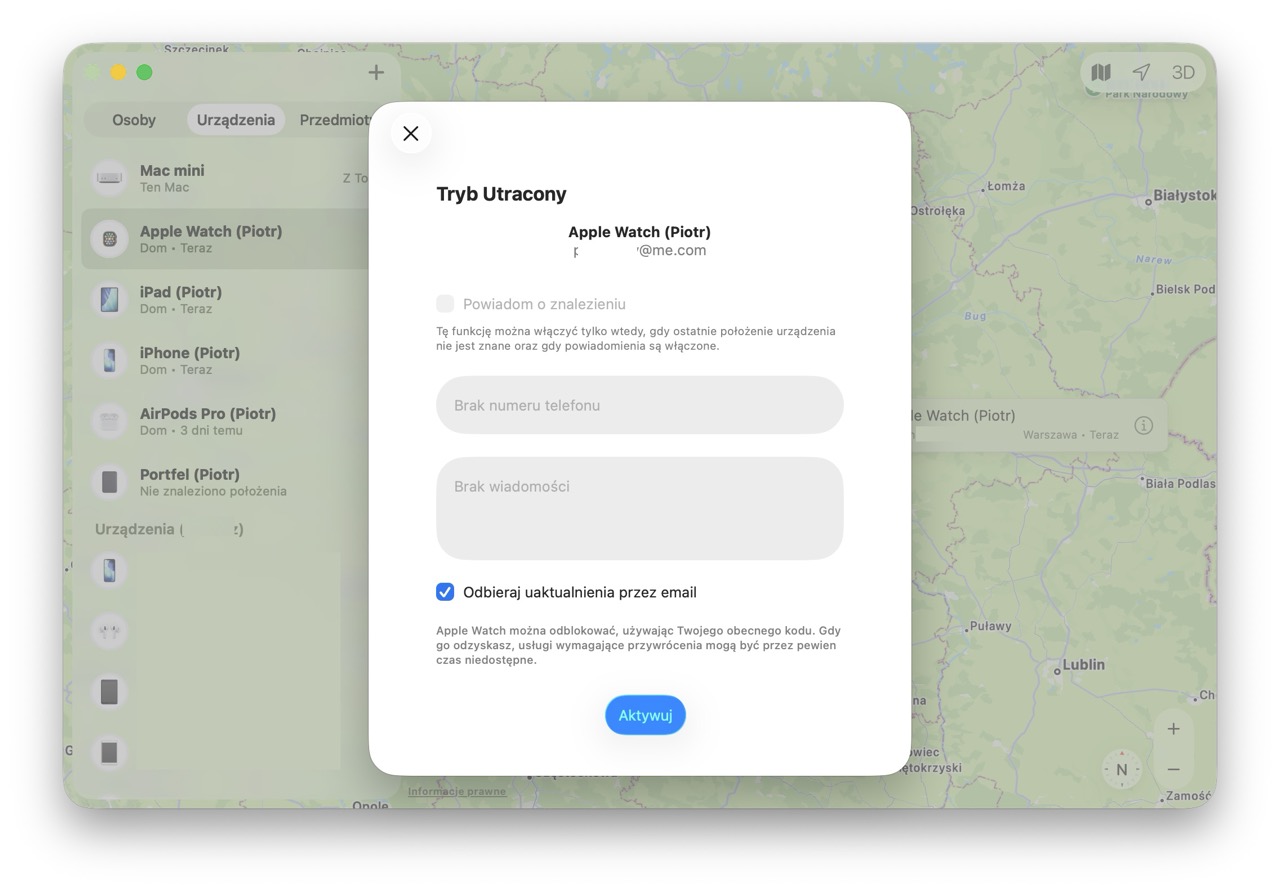 Aktywowanie funkcji Utracony w aplikacji Znajdź od Apple’a