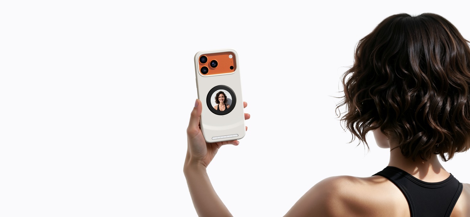 Kolejnym równie ciekawym rozwiązaniem Selfix jest dedykowany zewnętrzny ekran w kształcie koła. To 1,6-calowy panel AMOLED pracujący w rozdzielczości 480 × 480 pikseli. Do czego on służy? Np. do wyświetlania podglądu z tylnej kamery podczas robienia zdjęć. Może trochę wpłynąć na czas pracy iPhone’a – producent stworzył przycisk, który dezaktywuje dodatkowy panel, gdy nie będziemy go potrzebować.